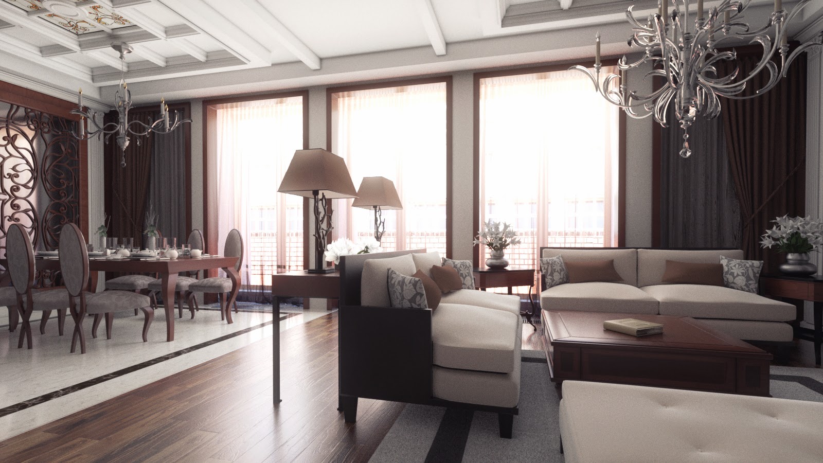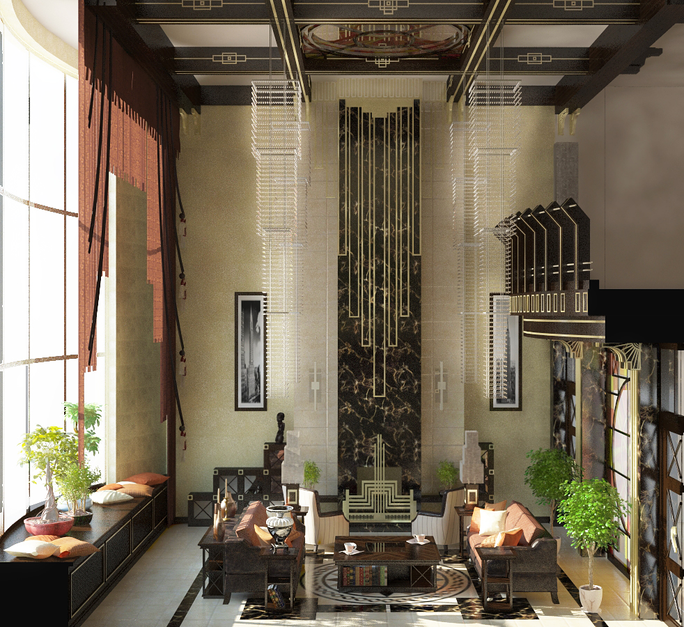 Design of a large bright room in the style of Art Deco