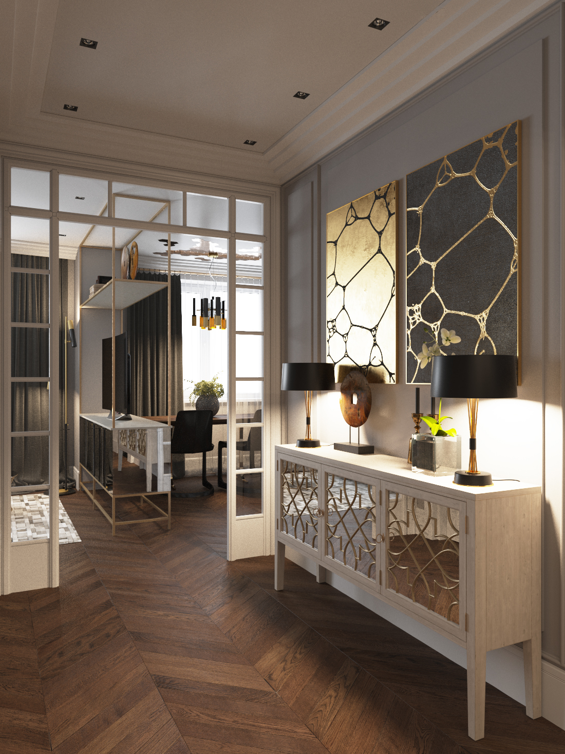The skin of a zebra on the floor, sculptures, vintage posters, mirrors, floor, table vases - all these details complement the interior in the art deco style - an interior that speaks of luxury, but does not shout about it, and therefore it looks harmonious and modern.