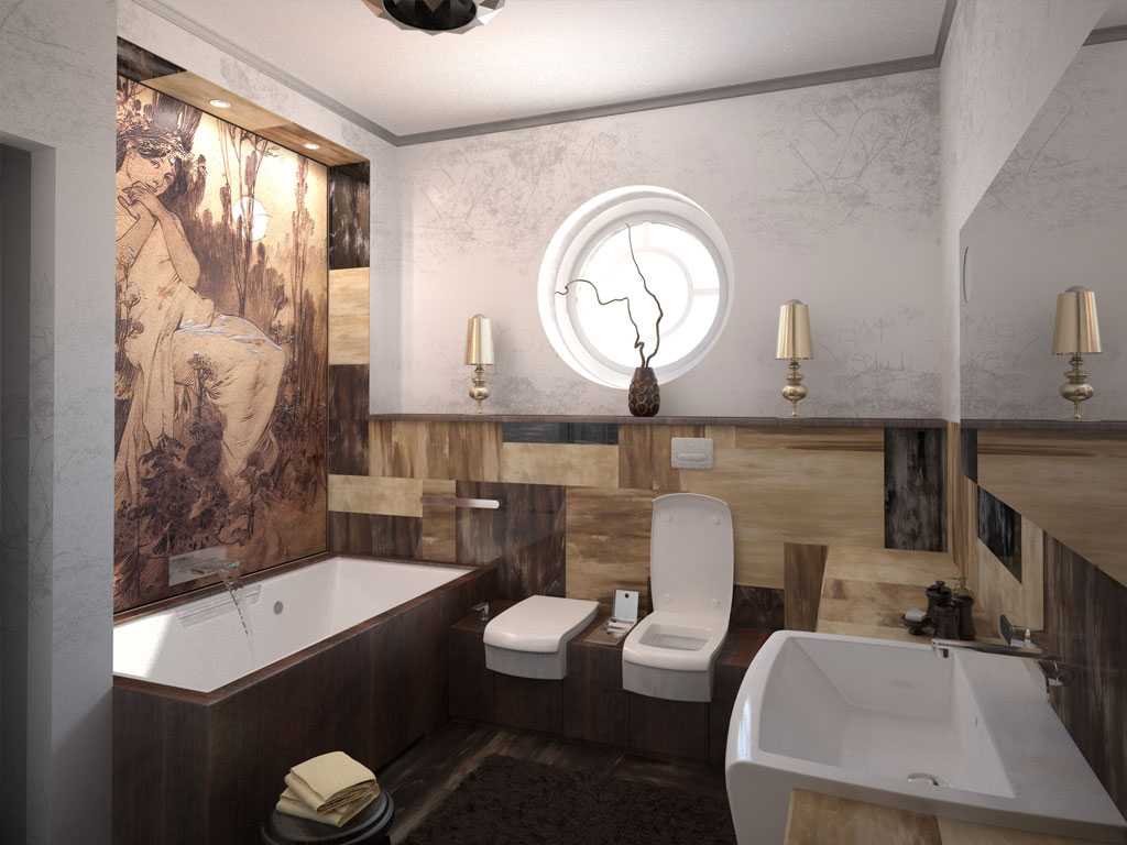 - Art Deco in the bathroom is designed to delight. Large tanks of an original form and non-standard approaches to lighting are appropriate, utilitarian objects are hidden behind doors in niches and cabinets.