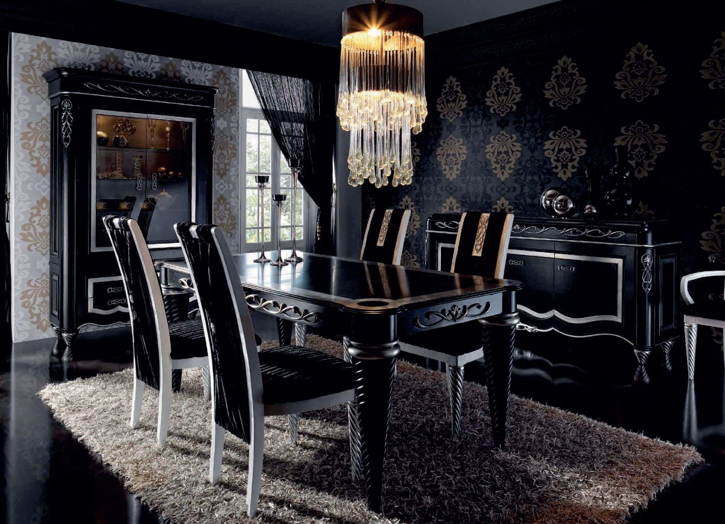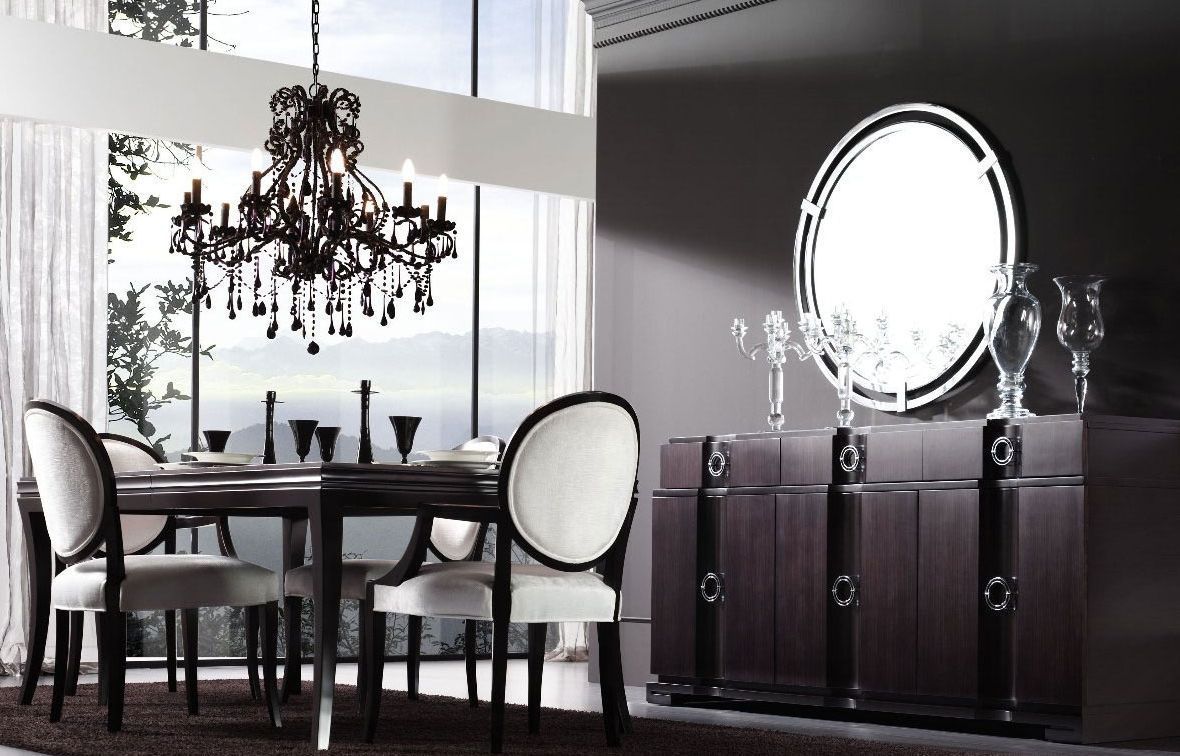 The furniture is light, luxurious and functional, it is convenient to use, despite the chic upholstery made of silk, velvet, natural fur or leather of exotic animals. In a spacious apartment, the dining area, regardless of layout, looks more like an elite restaurant than a common place to eat. It should be complemented by an elegant dining set with a large table and chairs with oval backs. The original decor will complement the luxury of general and local lighting, as in the photo.
