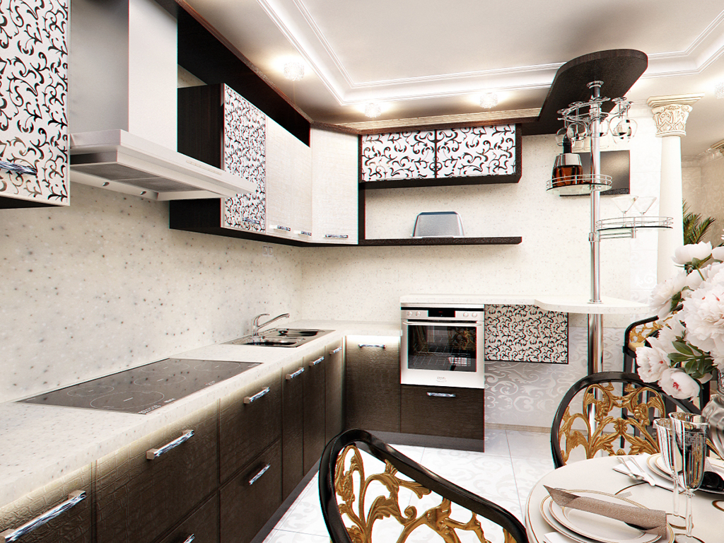 - The interior of the Art Deco kitchen is characterized by the use of cabinet furniture with a beautiful facade, preferably varnished, glossy or polished veneer made of valuable wood. Lighting - large chandeliers with lenses instead of practical shades. Household appliances are appropriate, but they should have a decent design.