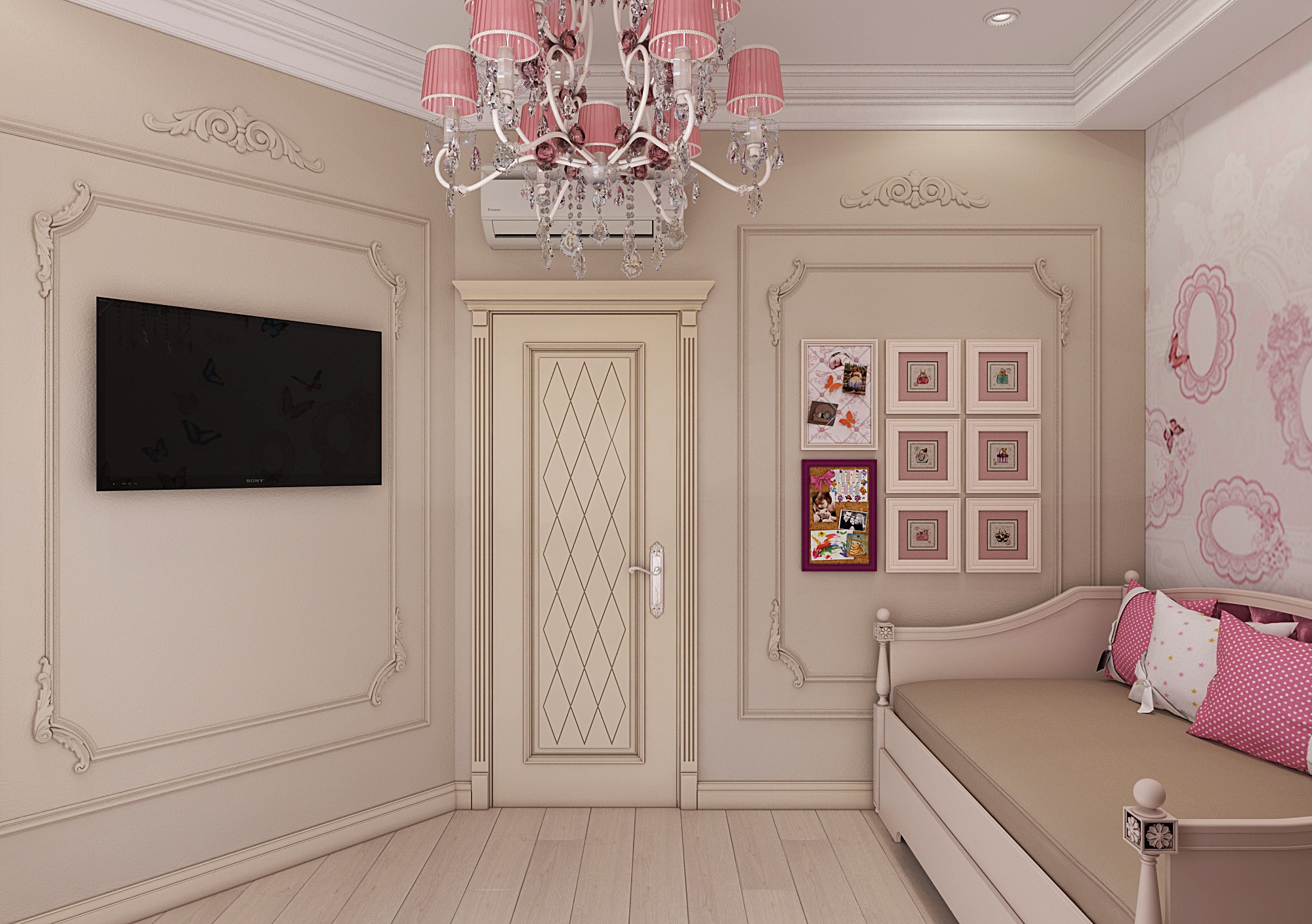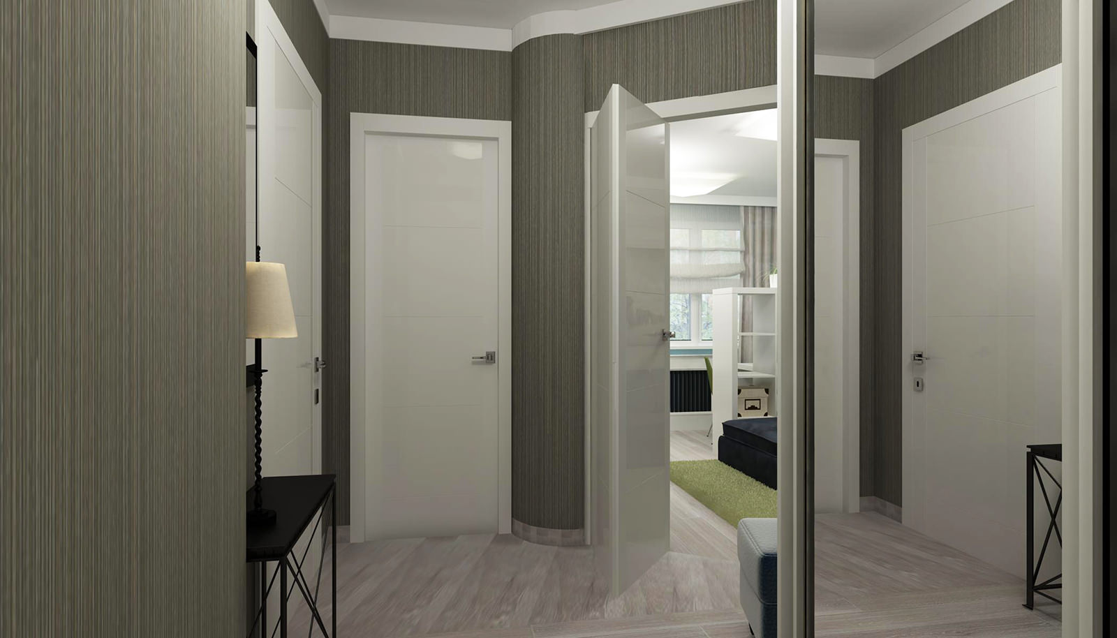 Room interior with white doors.