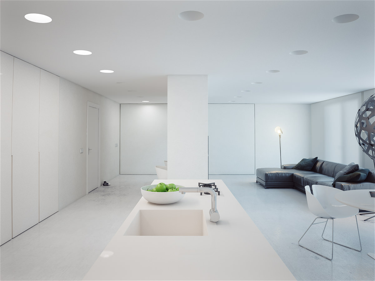 - visual expansion of space - white doors are invisible against the background of the same plain wall, this visually increases the area of the room.