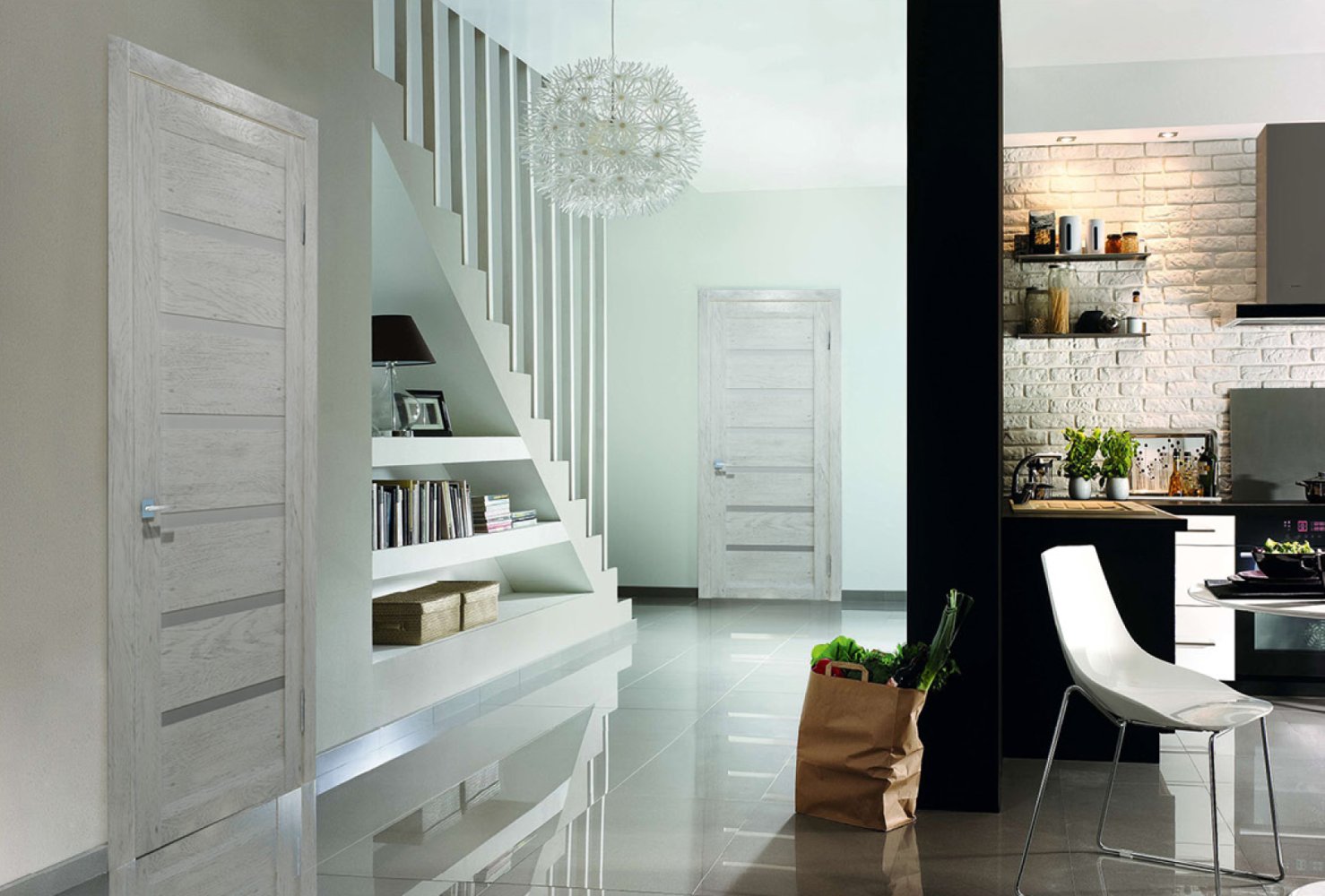 Designers use the most daring combinations of color and materials to create a unique home environment. White door leaf can be combined with other elements.
