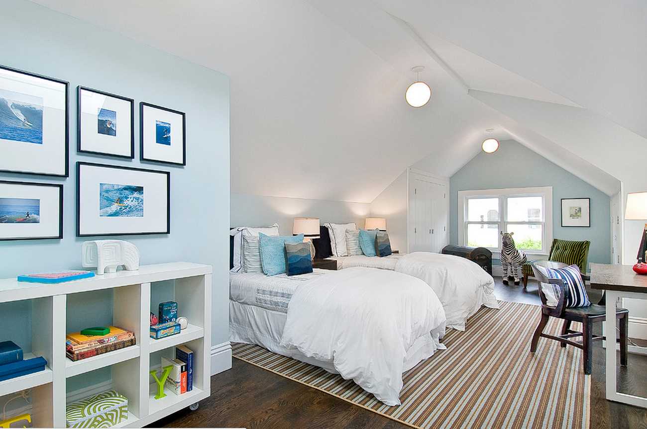 - Gray is not the best choice in the design of a room for two teenagers, but the gray-blue or gray-lilac wall background is perfect for white, blue and pink furniture.