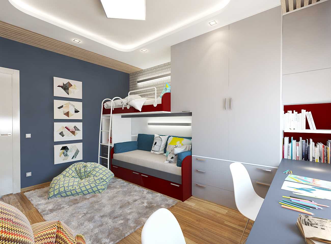 Sleeping area. The only important aspect in the decoration of the recreation area for two boys is a full bed with a quality mattress. Folding chairs and sofas have a negative effect on children's posture. To minimize the occupied space, you can use a bunk bed or a transformer bed.