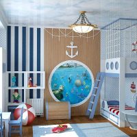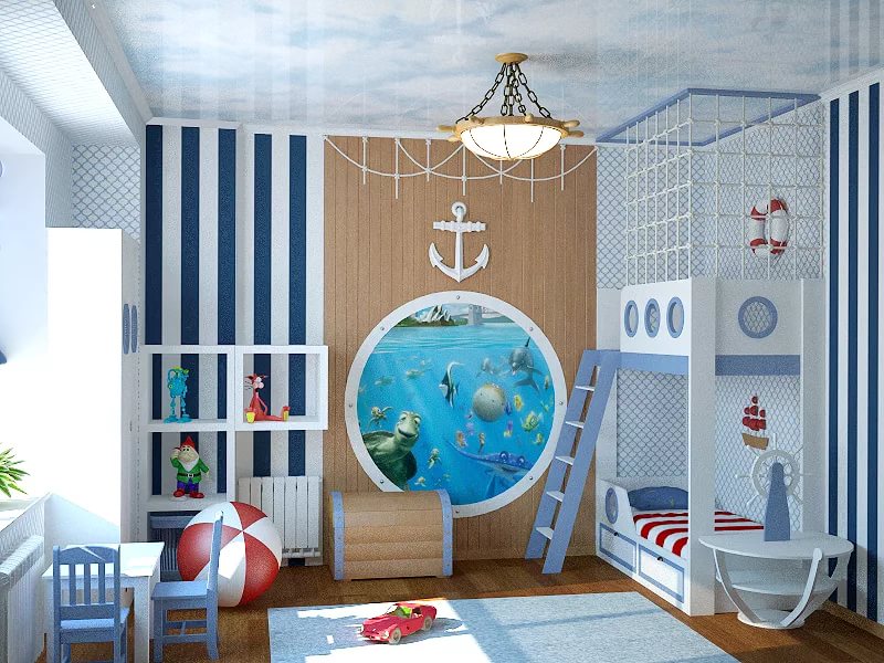 Additional Information! To create an atmosphere, it is convenient to use accessories in the form of anchors, paintings with ships and lighthouses. Accents of metallic shades on the walls of the nursery are possible.