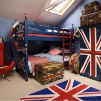 Such improvisation on the theme of the classic English style, has gone far from the original source. But the main thing is that the child should be comfortable in his space. The design of a children's room in the English style can have only one color spot - photo wallpaper with a view of London. Everything else can be done in white or grayish shades. The colors of the British flag can be painted cabinets or bunk beds.