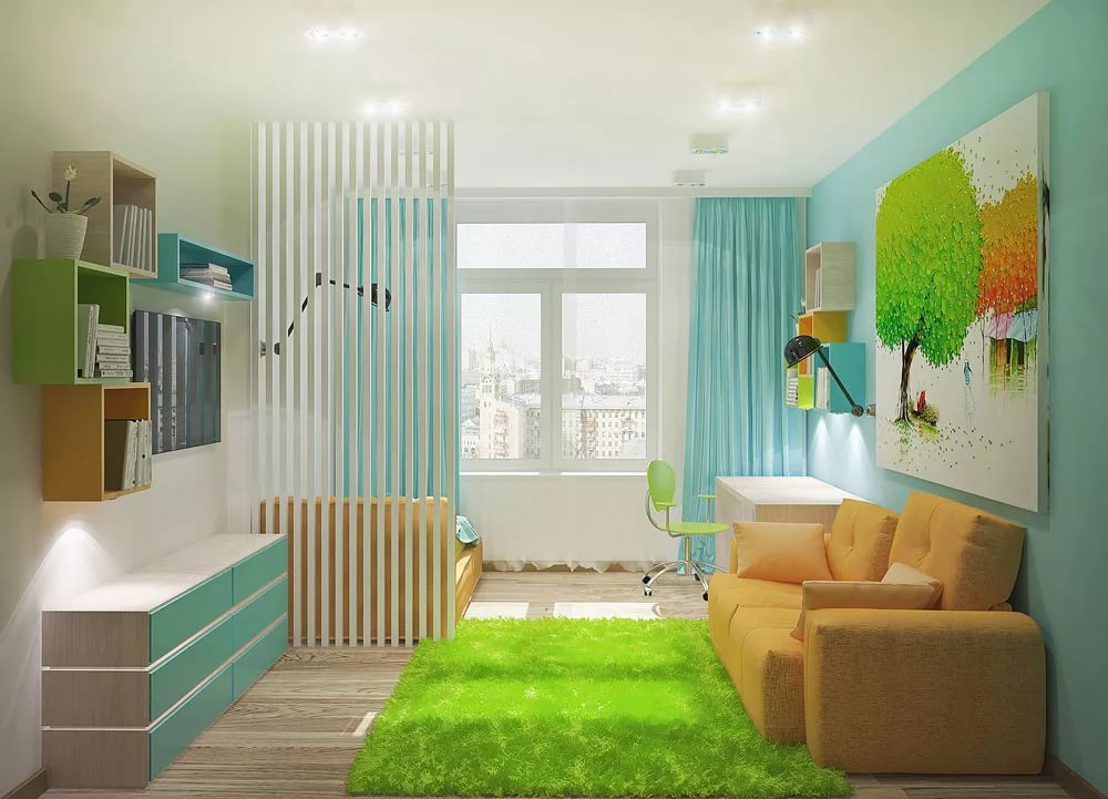 You can install moving partitions in the style of Japanese traditions in the children's room. Visual division involves, for example, painting the walls in various colors. The wall by the bed can have a calm mint color. Near the desktop and bookcase with books it is better to stick bright wallpapers with a dynamic plot.