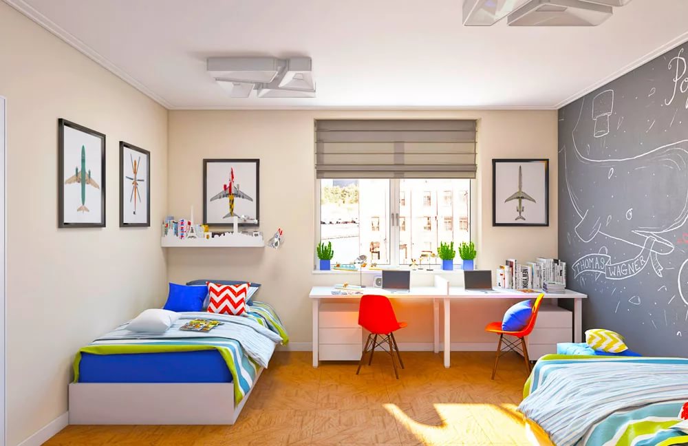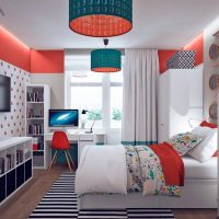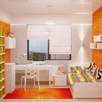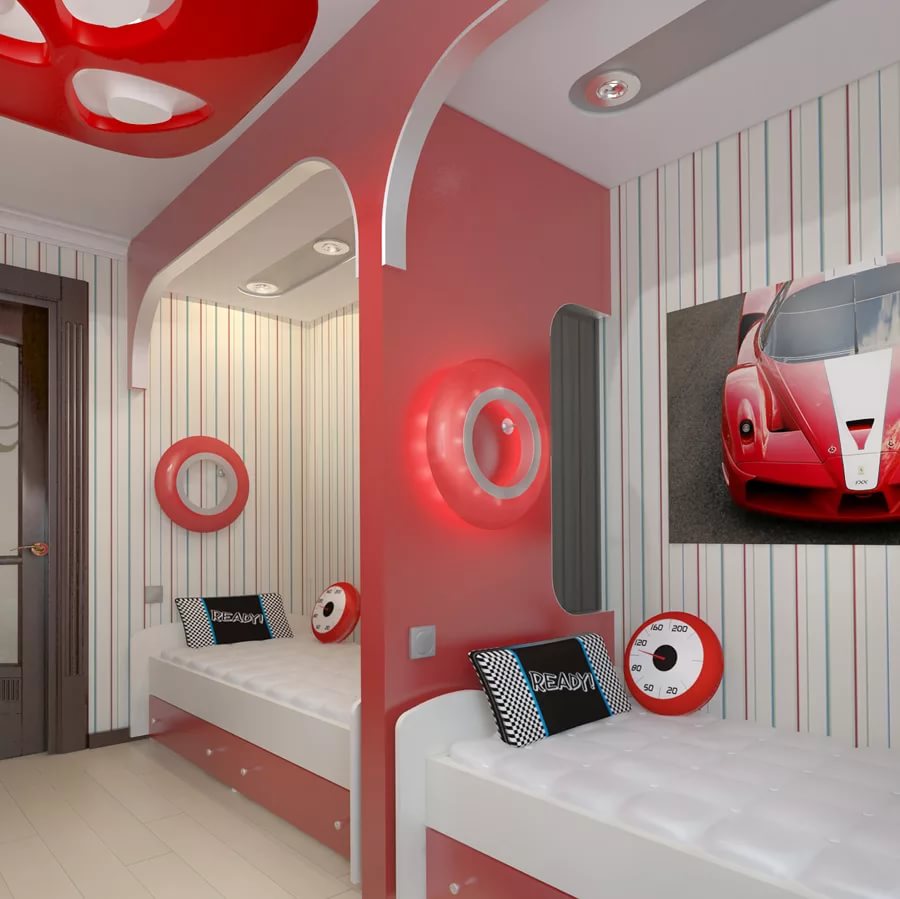 It has long been recognized that warm colors in a room are conducive to communication and activity. Cold - blue, green, inhibit nervous activity, contribute to relaxation, falling asleep. White, black and gray occupy an intermediate position.When choosing a design for a children's room for a boy or teenager 2019, this combination is at the peak of popularity. The interior in red and orange shades will prompt the inactive child to communicate, play, and intellectual activity.