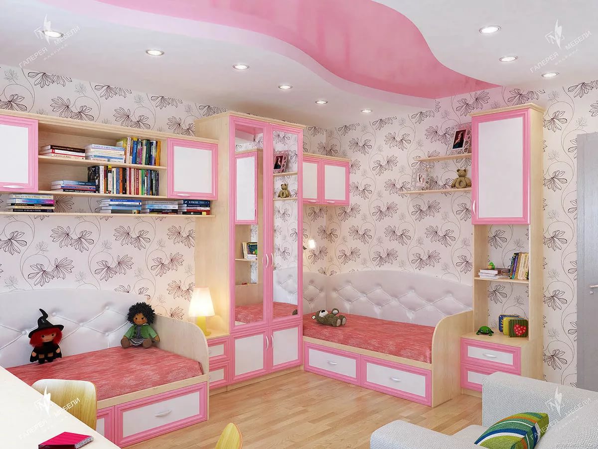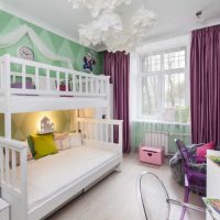 Standard cabinets can be varied by decorating with stickers. A convenient option is a wardrobe with many shelves and drawers. Doors with a beautiful design can act as a decorative panel or completely merge with the wall. To save space, the bed can be combined with a wardrobe. For kids who go to kindergarten, you can buy a children's table with chairs and a dollhouse. So the child will not be bored during the day if the parents are busy.