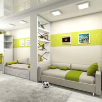 To ensure maximum comfort during games, recreation, intellectual activity, the room is divided into parts. This can be done in two ways - visually or physically. In a spacious room, a physical separation of space is possible. For example, the bed is separated from the rest of the room by a rack or blinds.