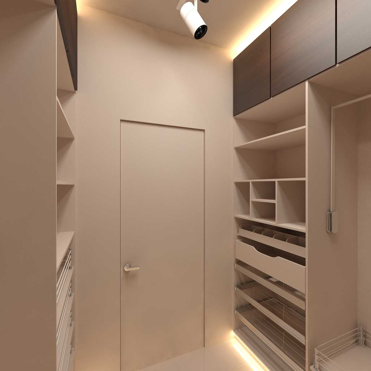 The interior door is the only entrance to the isolated (closed) wardrobe, equipped in a separate room. Sometimes, if the room is a passage, the passage will be through, that is, one door opposite the other, they must be made in one key.