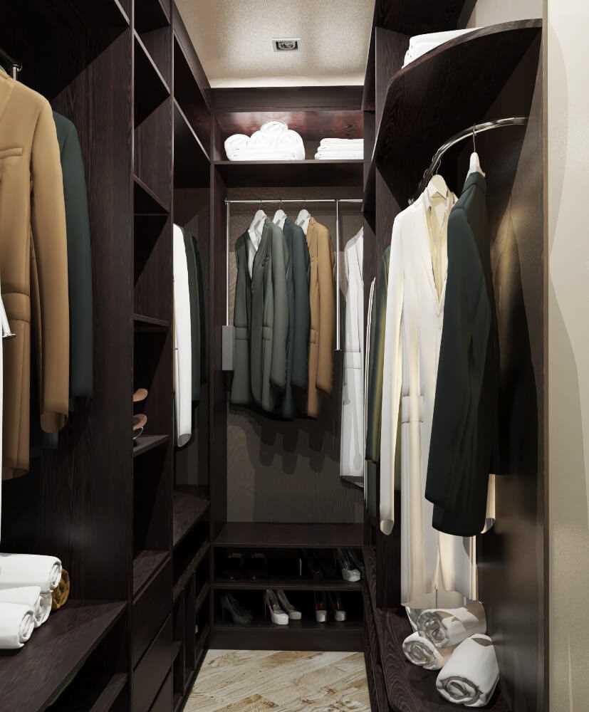 - The design of the U-shaped dressing room is usually consistent with a large room, where cabinets and shelves are located along the side walls. Often this is a dead end of a spacious corridor or hallway. In the interior design, the main thing is the material for the outer cladding.