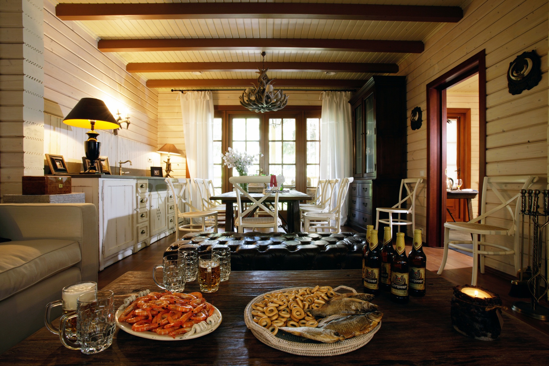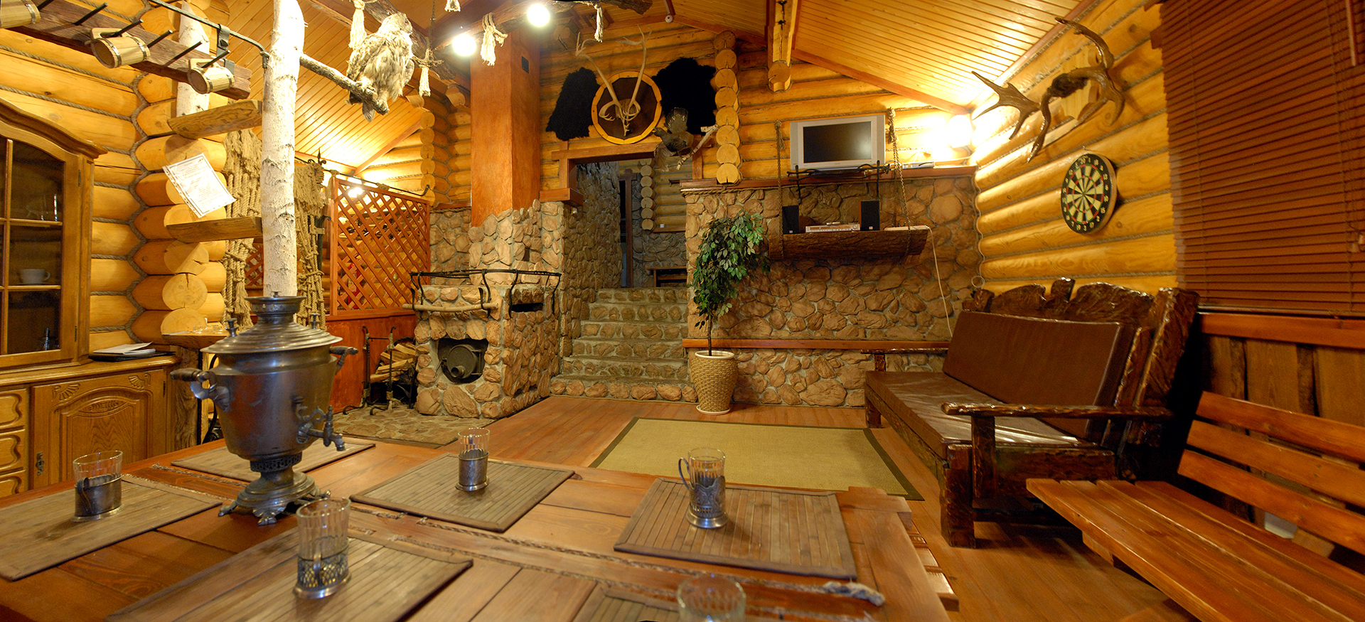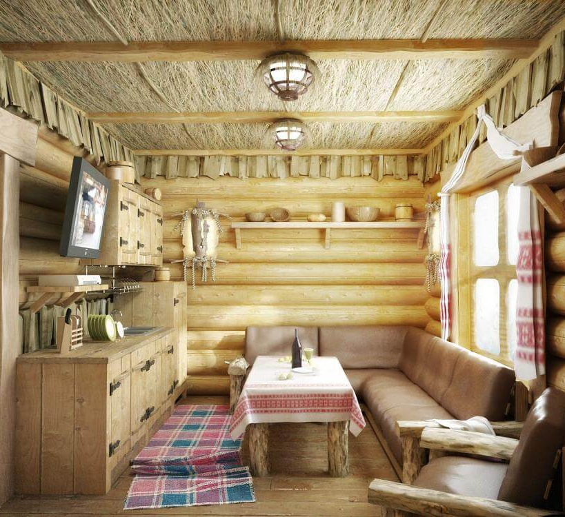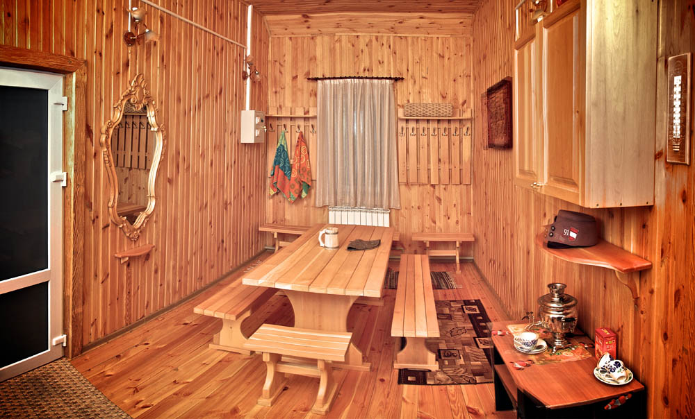 The most common design. The main feature of the style is the maximum use of wooden elements. Walls, floor, table and benches, utensils - all this should be made of wood of natural color. When decorating, tablecloths, curtains or towels with embroidery, bath brooms, bunches of dried herbs are used. Hang a pair of bast shoes on the wall, and put a Tula samovar with a bunch of bagels on the table and the Russian style is ready.