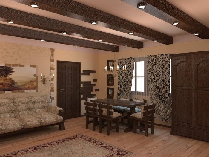 This style is very similar to traditional Russian. The use of natural materials, light colors, carved shelves and furniture create a "rustic" cosiness. Country style is divided into American (using traditional ethnic colors, home decoration) and French, more refined. Beams are necessarily present on the ceiling, and the floor is lined with boards or tiles. The main highlight of the style are bright ceramic dishes, paintings with rural landscapes, colorful fabrics.