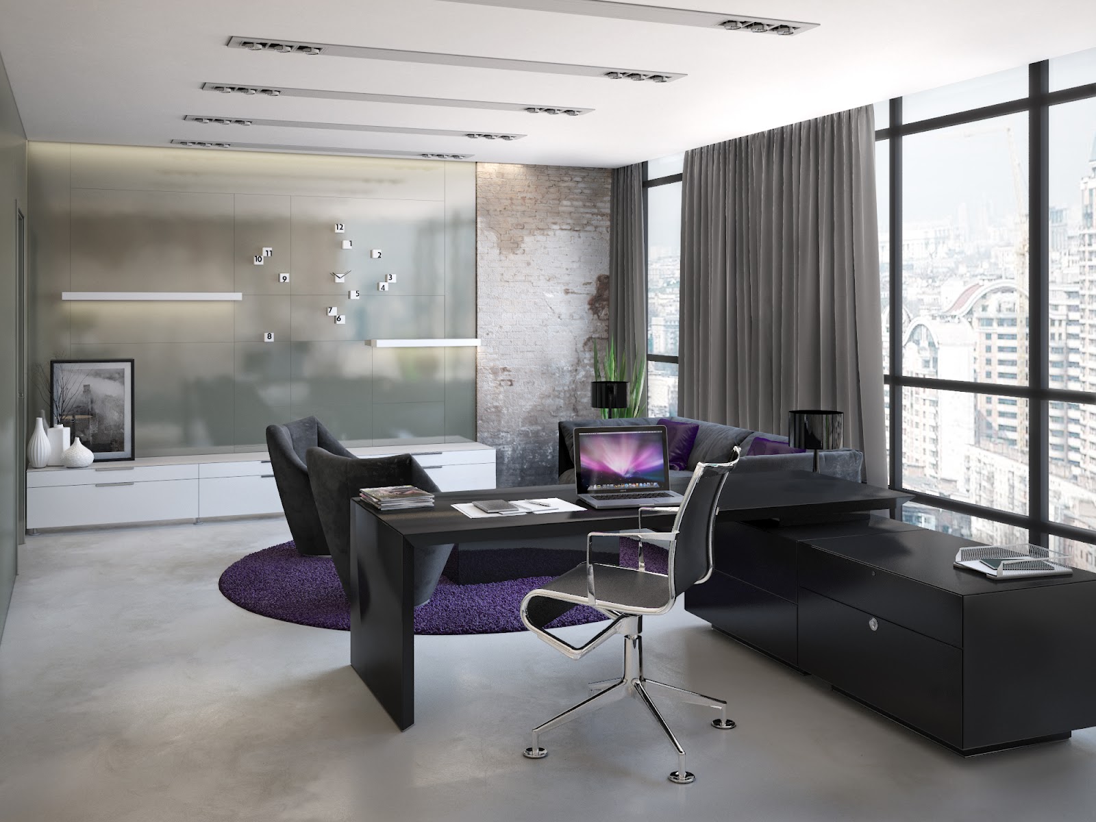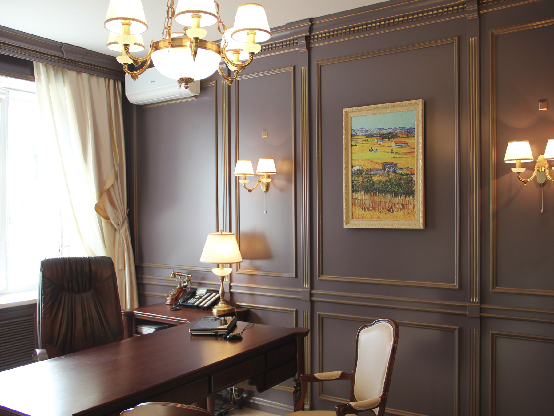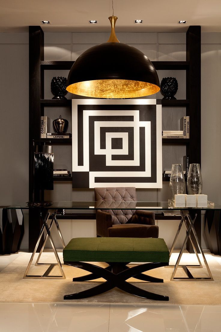 Do not neglect accessories and lighting fixtures when designing the head office. First of all, they think over the lighting in the working area. If a central chandelier is used, a table lamp or floor lamp must be present.