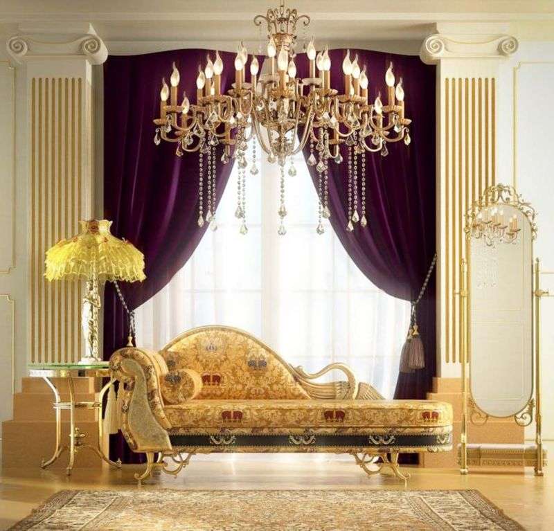 The materials used in the decoration must be of high quality and expensive. They emphasize the luxury and richness of style. The furniture is installed not only beautiful, but also comfortable. As for curtains, they should be dense.