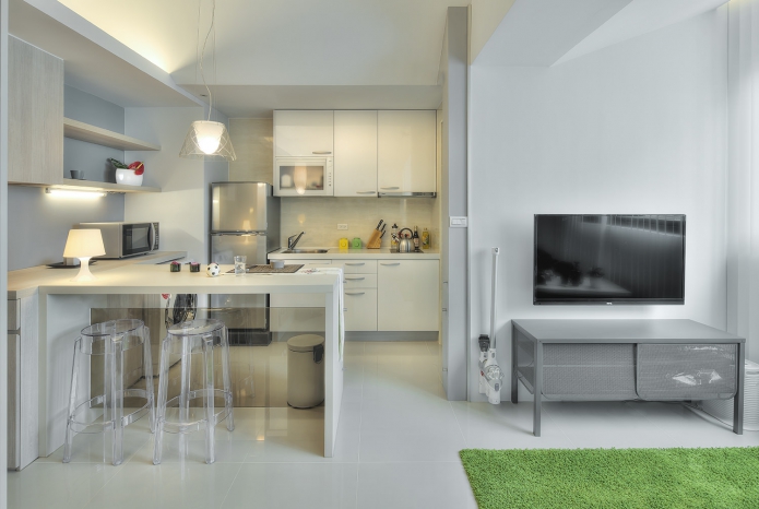A large dining table is needed only for a family of 3-4 people. It is imperative to provide a full-fledged work surface (top of the cabinet or folding tabletop) for cooking. A bar and a wide coffee table near the sofa bed or in the center of the guest island is enough for 1-2 residents.
