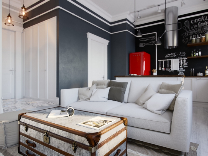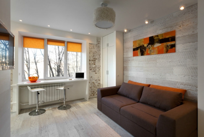 A small footage of the “studio” is the possibility of its creative self-expression, where it is easy to emphasize some design concept or vision of aesthetics. It is as functional and economical as possible, especially in the heating season, as well as in terms of repair costs.