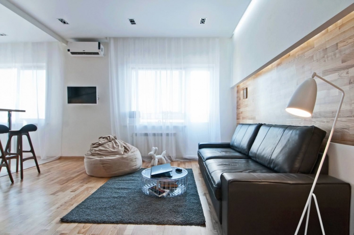 The absence of stationary partitions and interior walls is a great advantage in terms of functional changes. With the birth of a child, it is easy to transform interior design of a small apartment «studios», adding a kids corner with a play area. When changing your lifestyle, you can expand the workplace to perform additional tasks remotely at home. If guests are often in the house, it is recommended to "build up" a soft corner with additional seats.