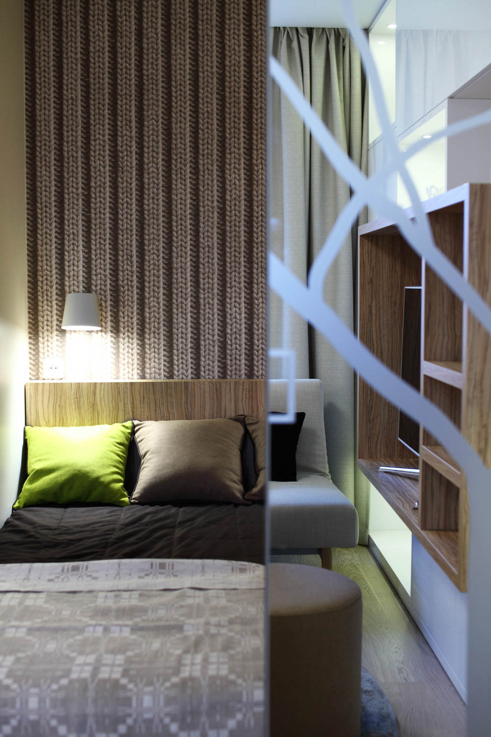 The visual division of the room into the living room and sleeping area is made of vertical wooden slats. They can change their position on the principle of blinds and, if necessary, visually hide a place to sleep.