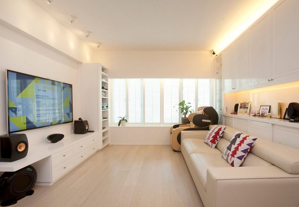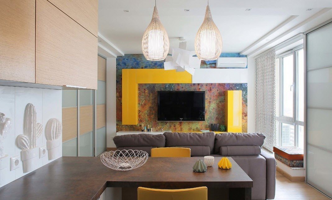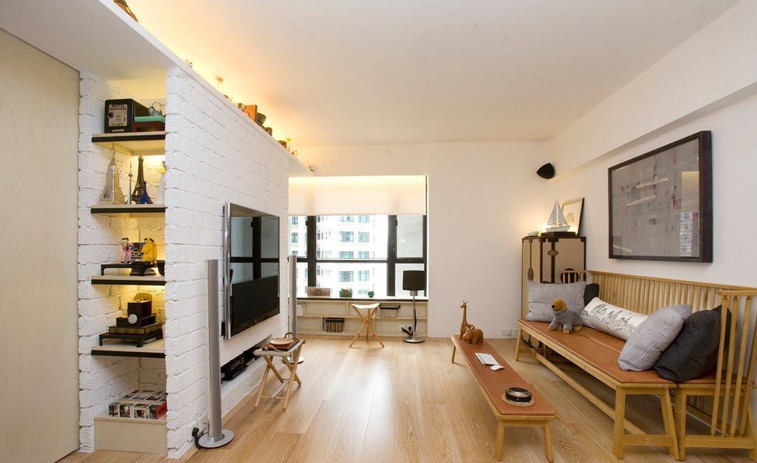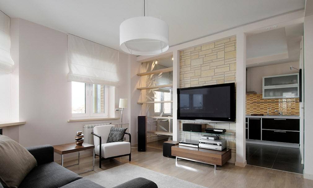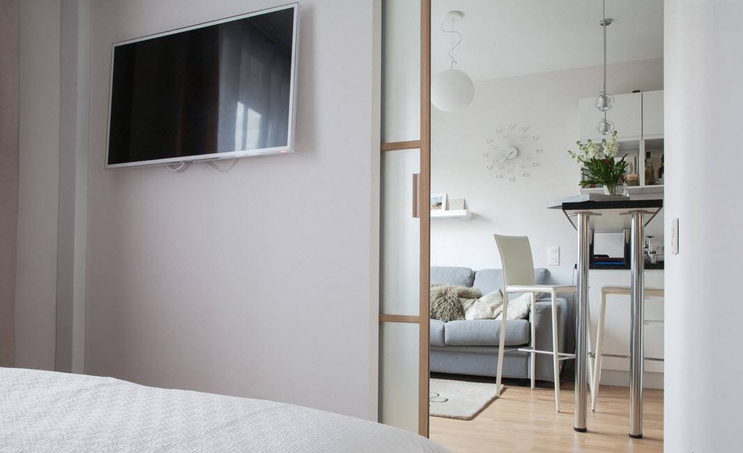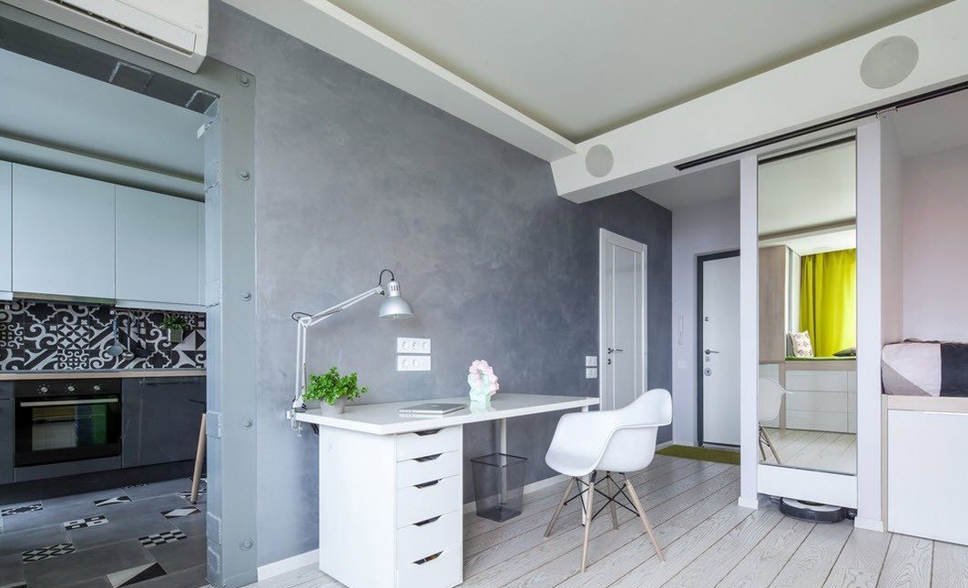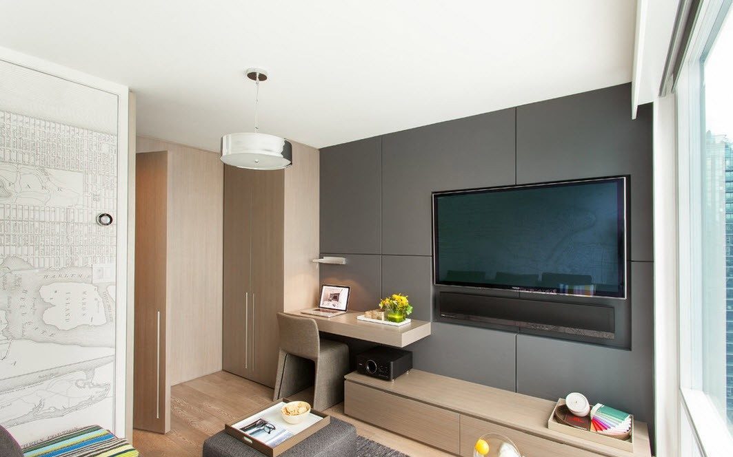 Modern technologies make life comfortable even in a small one-room apartment. In fashion, simplicity and minimalism. For example, several years ago, in every house, a television stood on a pedestal. Now this is not relevant, it can stand on a hanging stand or mount to the wall. That allows you to significantly save space.