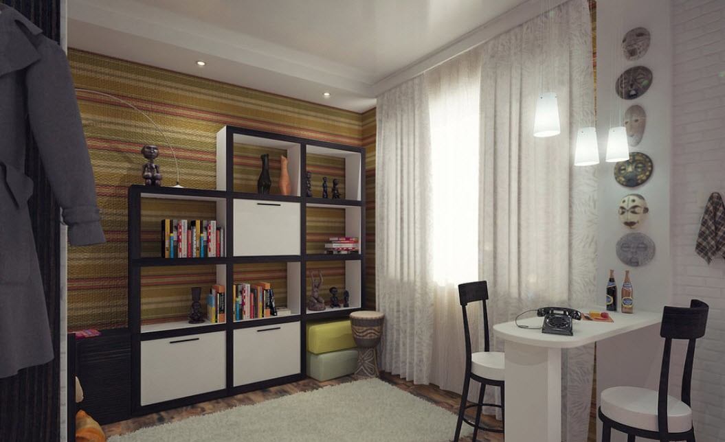 If in one-room apartment If a family of 3 or more people lives, it will be more comfortable if the areas for work and leisure are separated from each other. To do this, you can use the floor shelf, screen, thin partition.