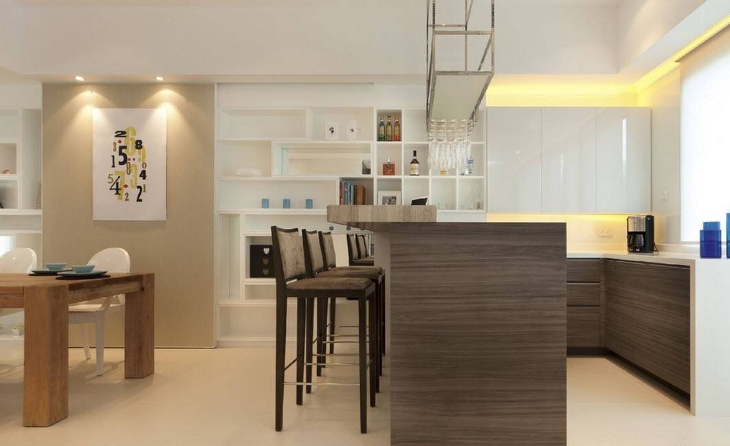 On the ceiling, LED lighting elements are placed, which are turned on separately, highlight the main areas of the room with light, obscure some corners of the apartment.