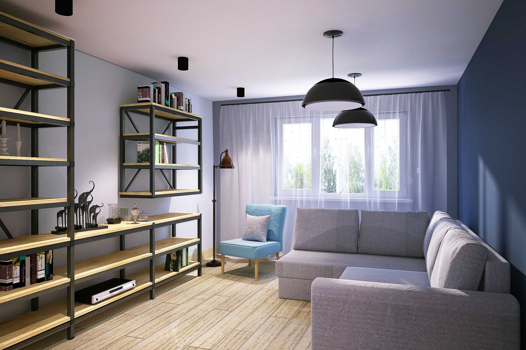 The space of the walls is finished in a combined way. If the three-bedroom apartment is narrow and elongated, you will have to purchase a folding sofa. The wall behind the sofa is finished with wood paneling or small pieces of wood tile. Non-standard solutions will look interesting. For example, OSB boards painted using special technology. The wall section opposite is organized by a gray laminate. Ceramics are also suitable here. The size of each item is large. A TV is mounted on top of this finish.