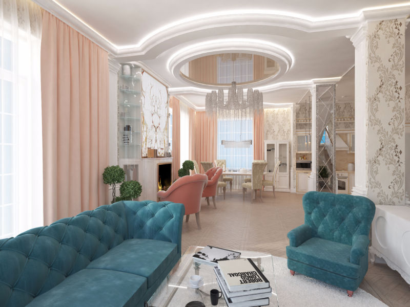 The ceiling can be made in several levels. If the height allows, three steps are made. The first comes from the corner of one wall. Its border is framed by LED strip as a decorative highlight. Spotlights will also fulfill their functional purpose. The central part of the living room ceiling is hung with a voluminous chandelier. The color scheme is necessarily white, complementing the overall design idea. This will be the second zone. The rest is organized by the third step. Lighting elements here may be completely absent.