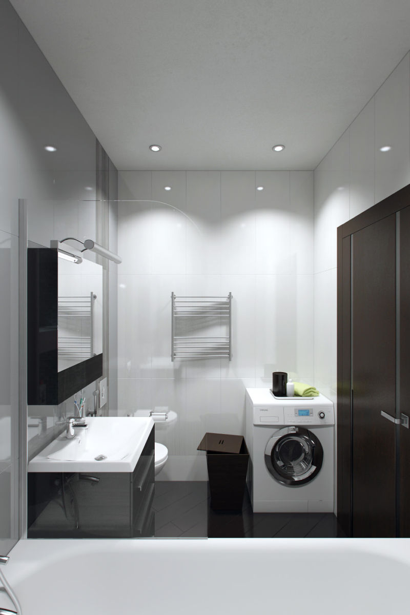 The flooring here will suit both tile and laminate. The texture should be smooth, glossy. The color scheme is light, not creating a load.