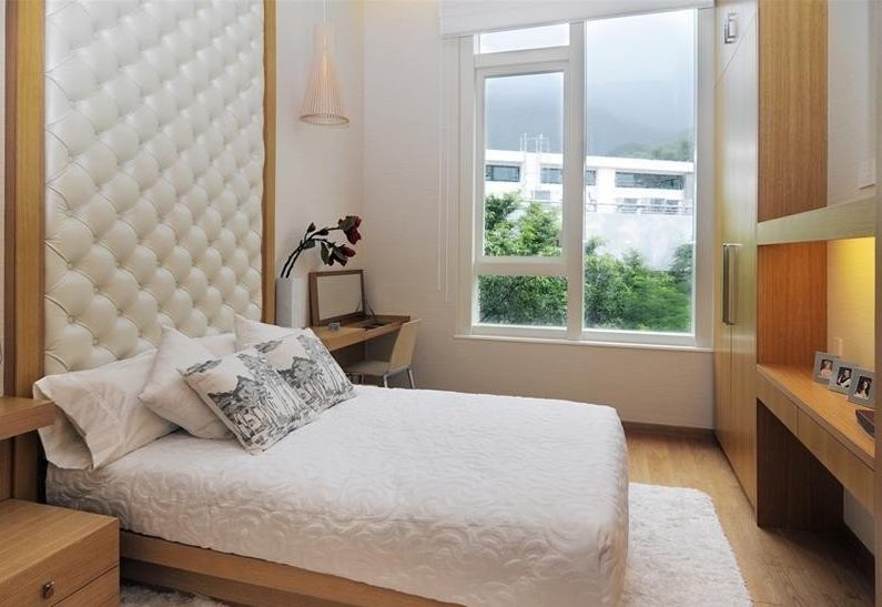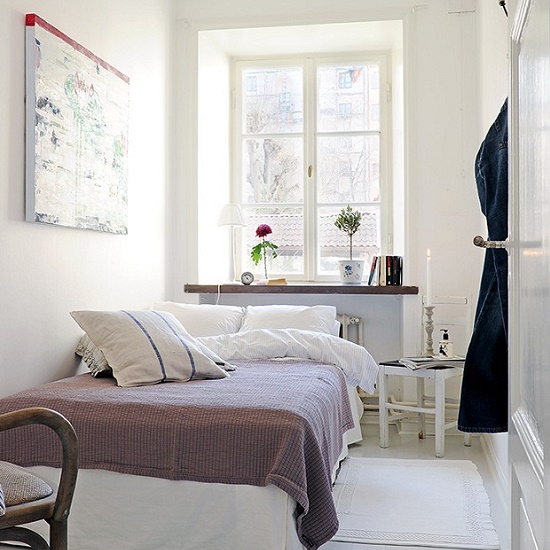 Design of a narrow bedroom with a window at the end