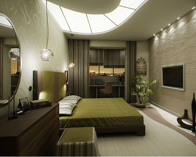 The ceiling space of a small room can be equipped with two levels. It is not necessary to make a standard perimeter rectangle. Such an arrangement will create certain frameworks that are completely unnecessary here. Instead, arrange the ceiling in two different halves. Use smooth lines. An interesting option would be the layout of the three components. At the same time, the middle part of the bedroom on the ceiling will be indicated by a certain “cavity”, which can be decorated with a different color from the rest.