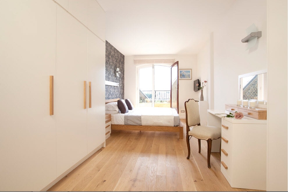 In the elongated bedroom, the furniture is placed alternately. It will be rational to put a desk or a dressing table by the window, a bed can be placed in the center, and a closet by the opposite wall