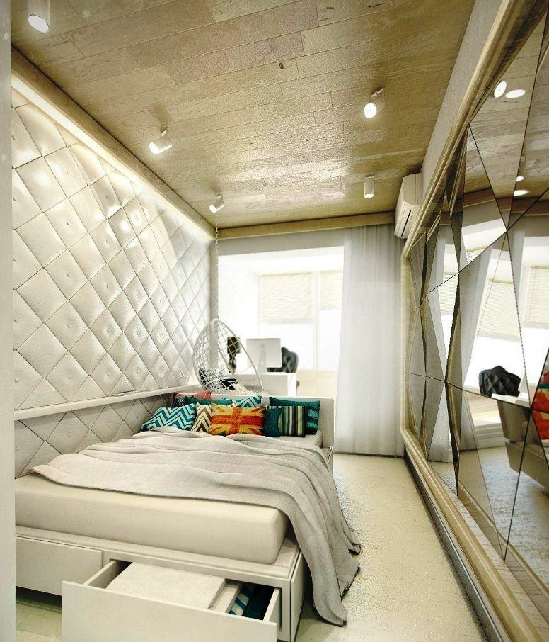 When placing a berth near a long wall, arrange the wall space with soft upholstery. Additionally, attach the sofa buttons to create a tie.