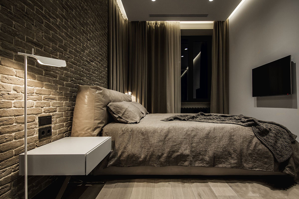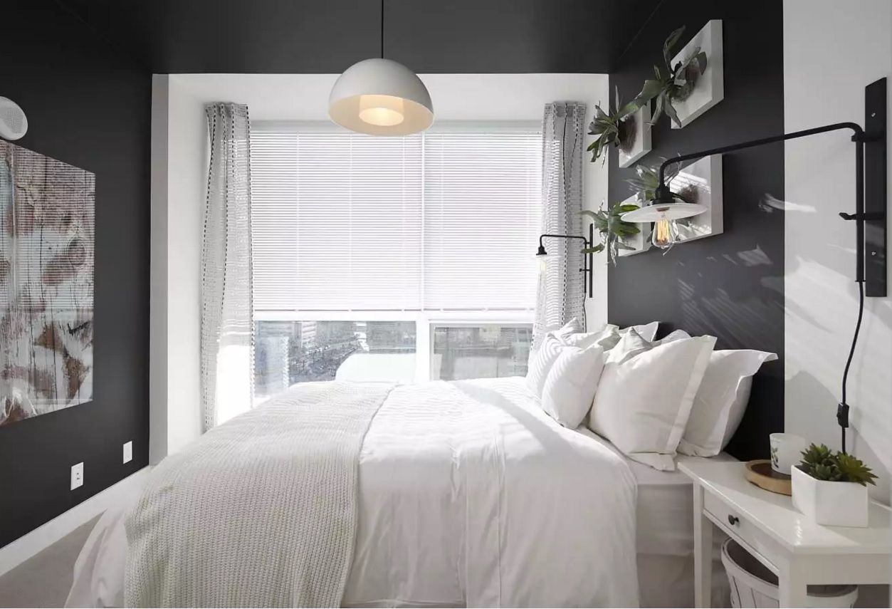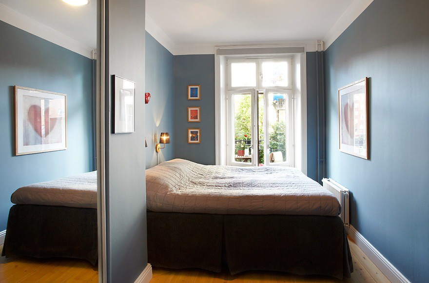 The combination of contrasting shades visually enlarge a small bedroom