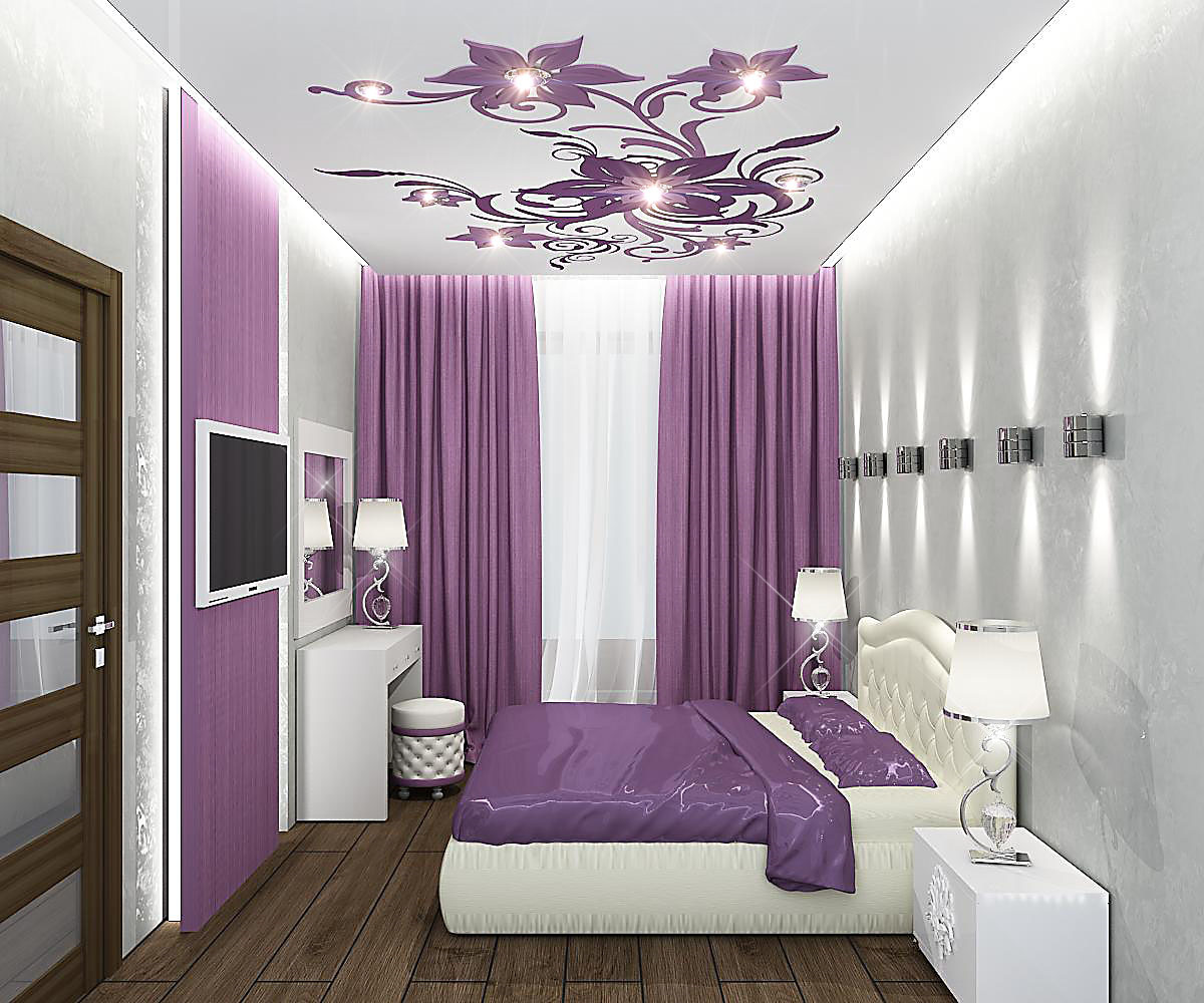 - Wall decoration. In order to visually expand the bedroom, long walls are finished with light materials. But short ones, on the contrary, stand out in bright shades.