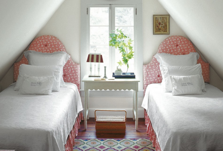 Bright kids room with striped bedspreads.