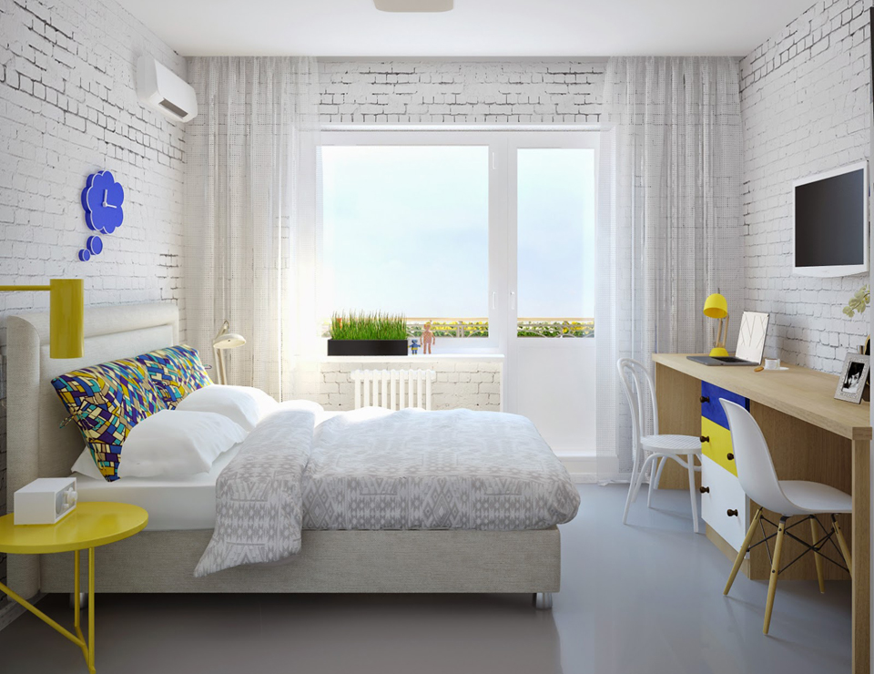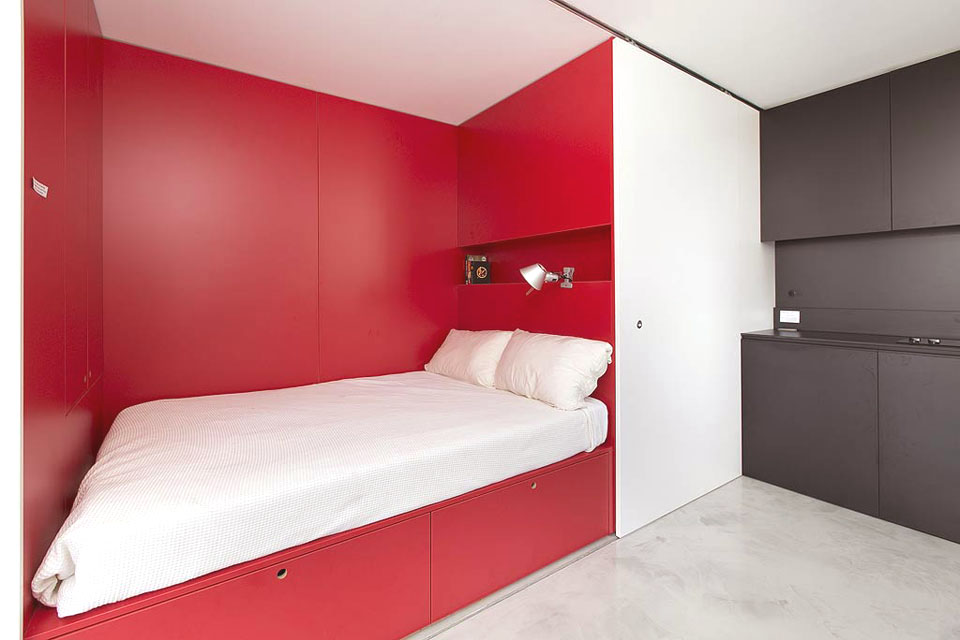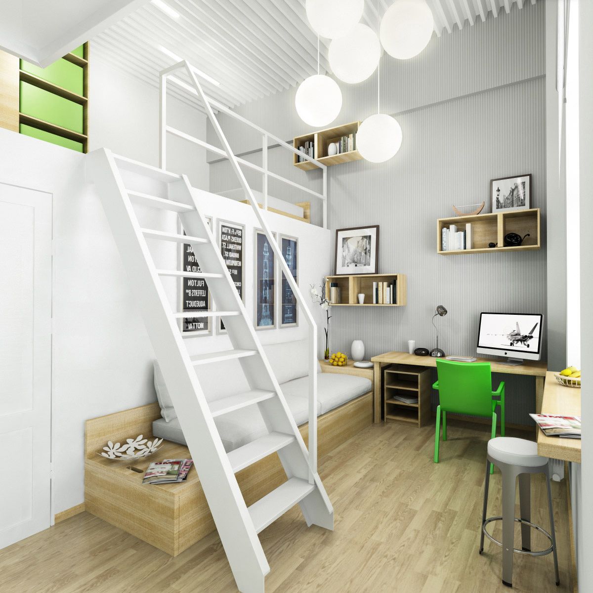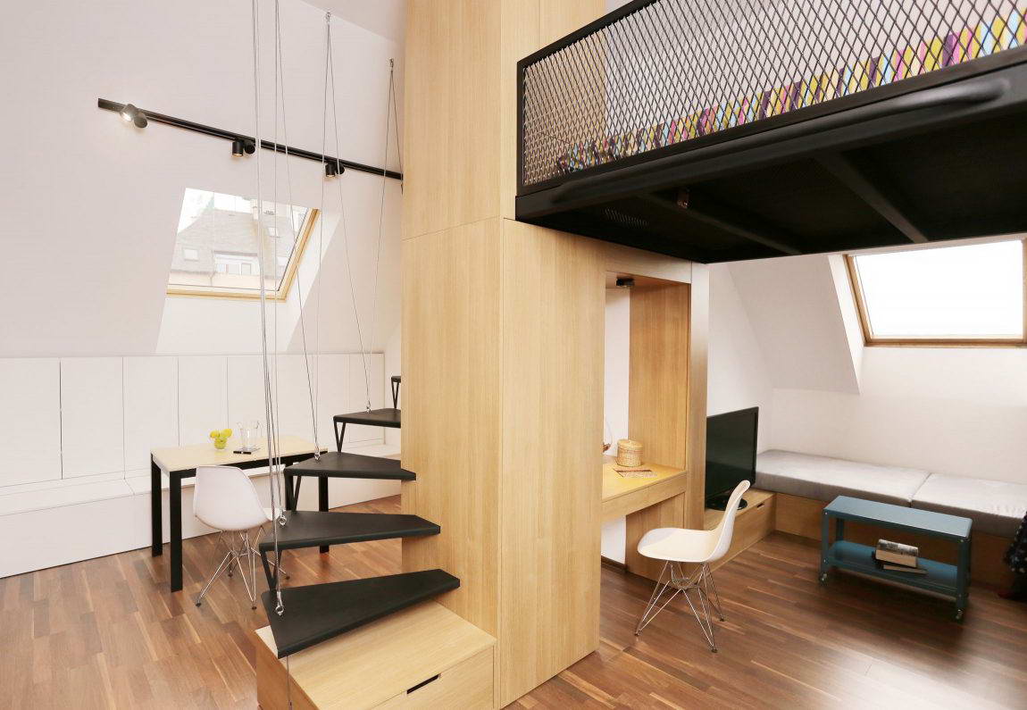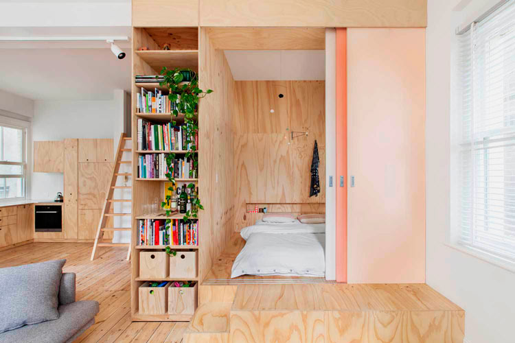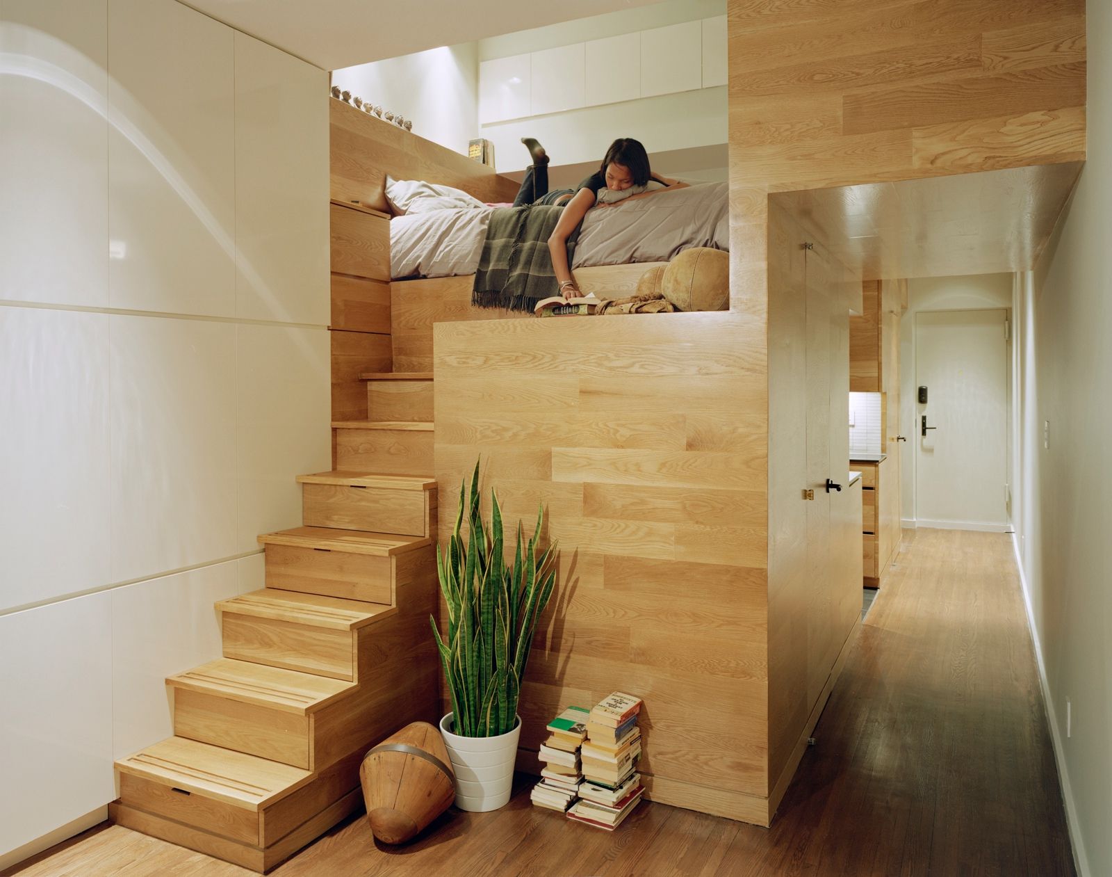 The problem of zoning the apartment can solve a cube-shaped wardrobe. The open part of the cube that goes outside is made for books, decor items, as well as clothes. Upstairs, sleeping space is organized. And inside the cube there is a place for a personal account, in which it is very convenient to engage in long-term projects. No one will disturb you here.