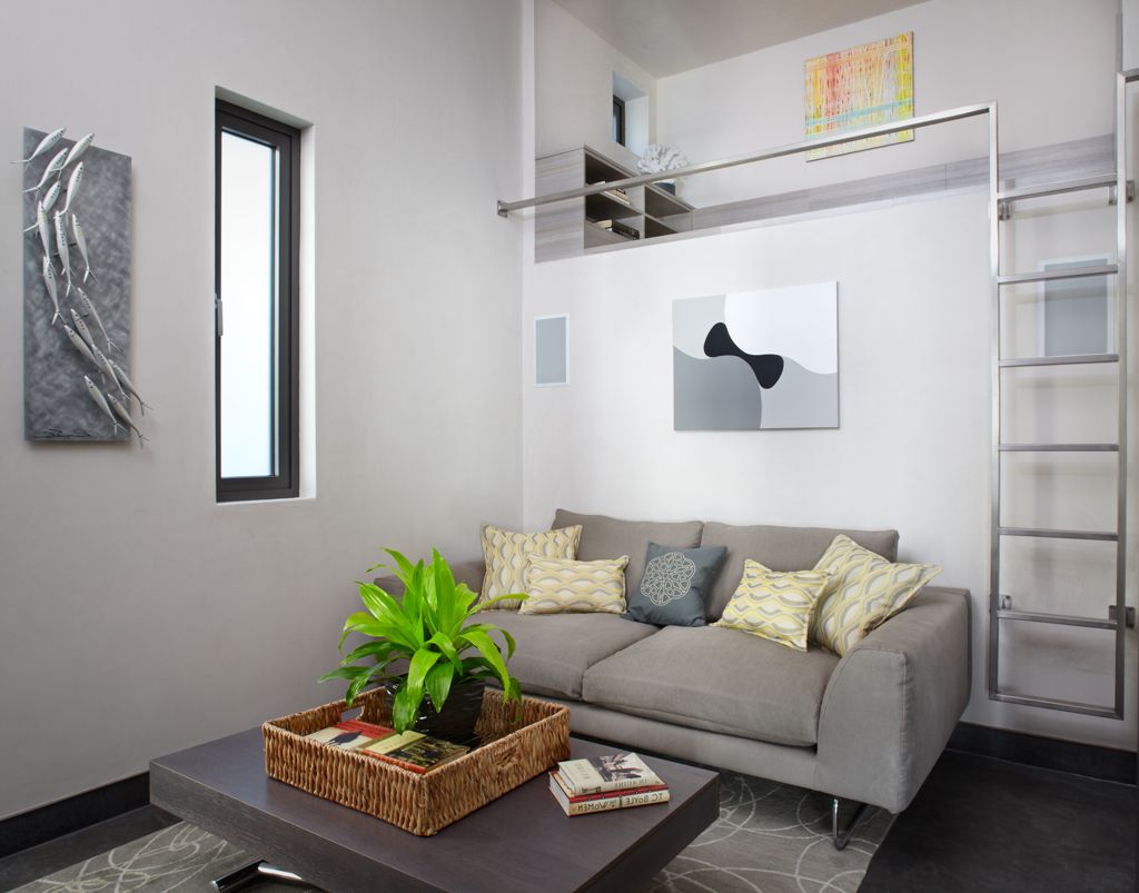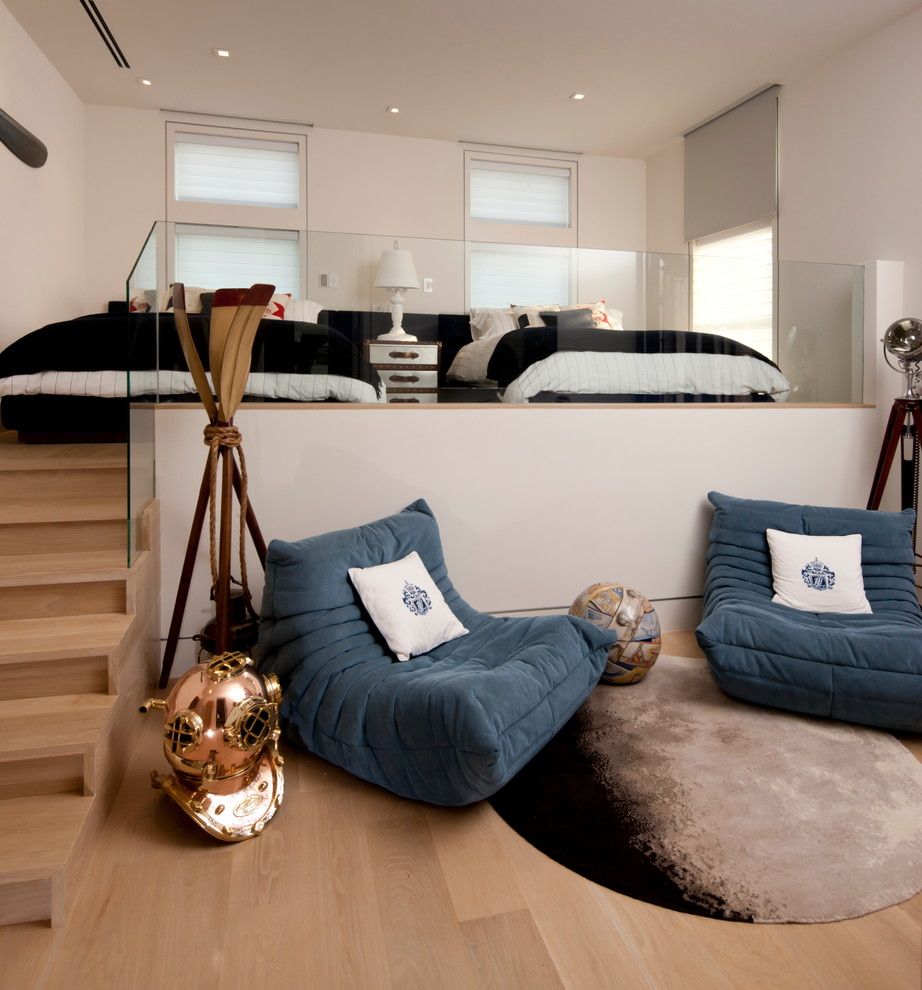 In studio apartments, the layout is always inspiring. New homes are being built with high ceilings. Therefore, often people make a berth under the ceiling. One common room combined with a living room definitely requires zoning. A niche in the ceiling is the perfect solution. Instead of stairs, steps are made, and in them there are also niches for nightstands.