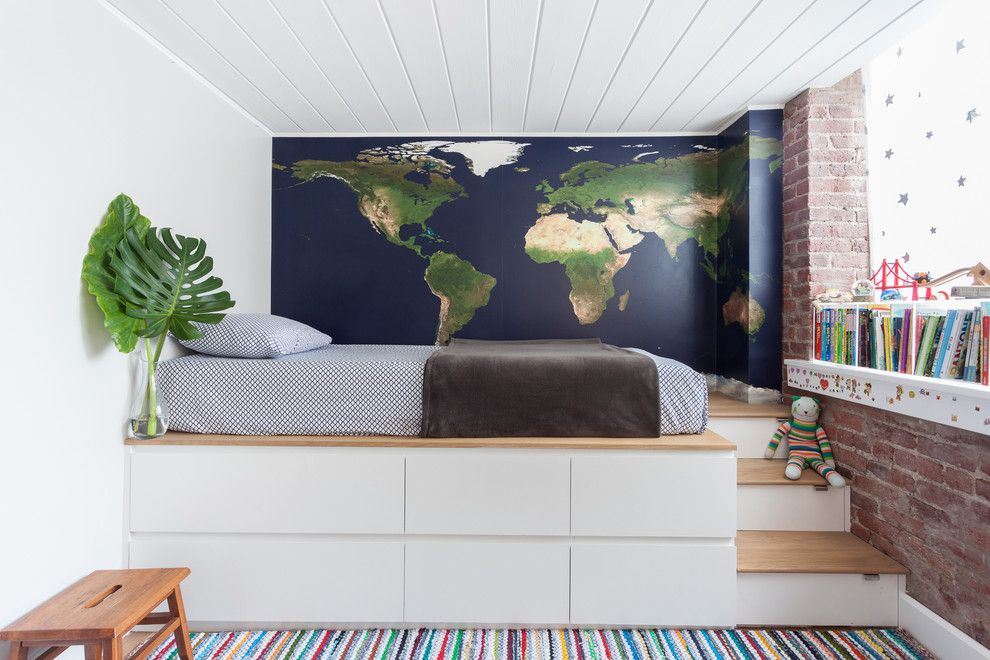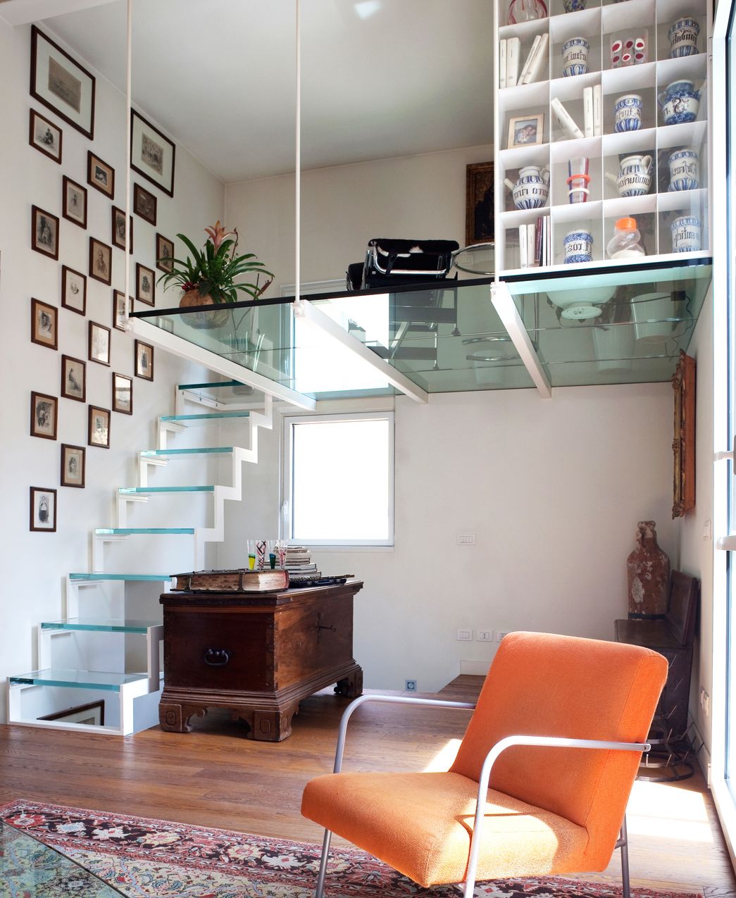 A staircase to the mezzanine with a bed can be made directly on the bookshelves.