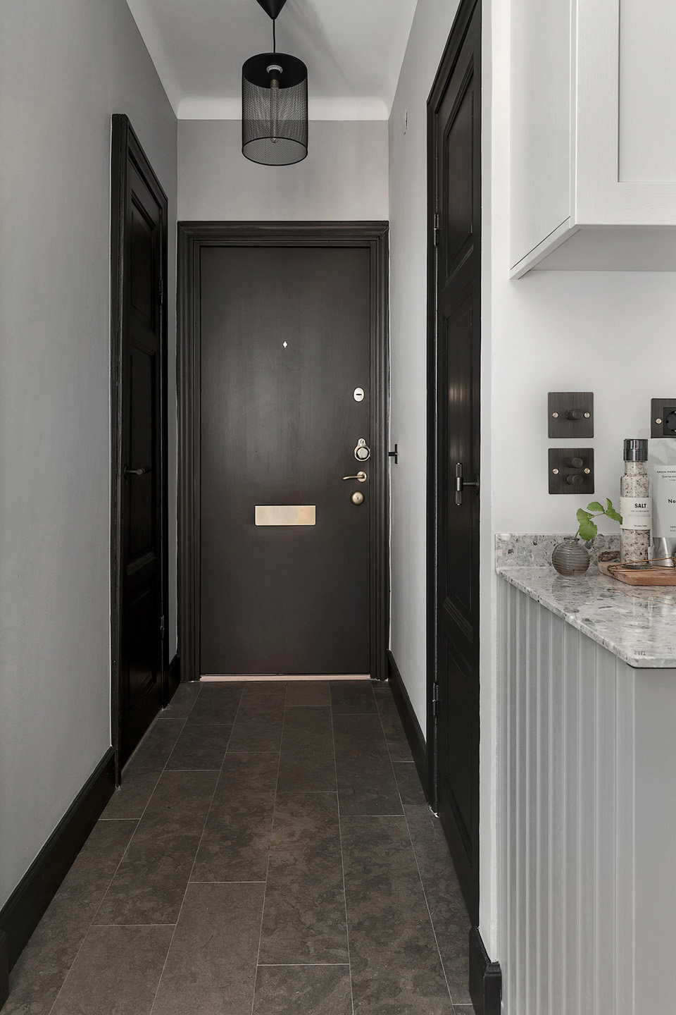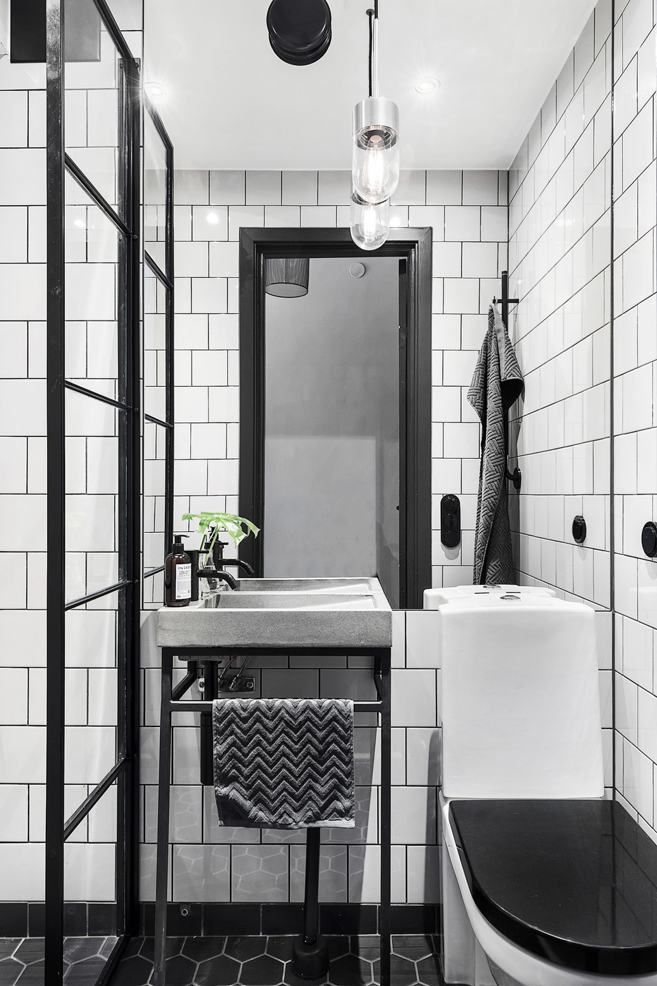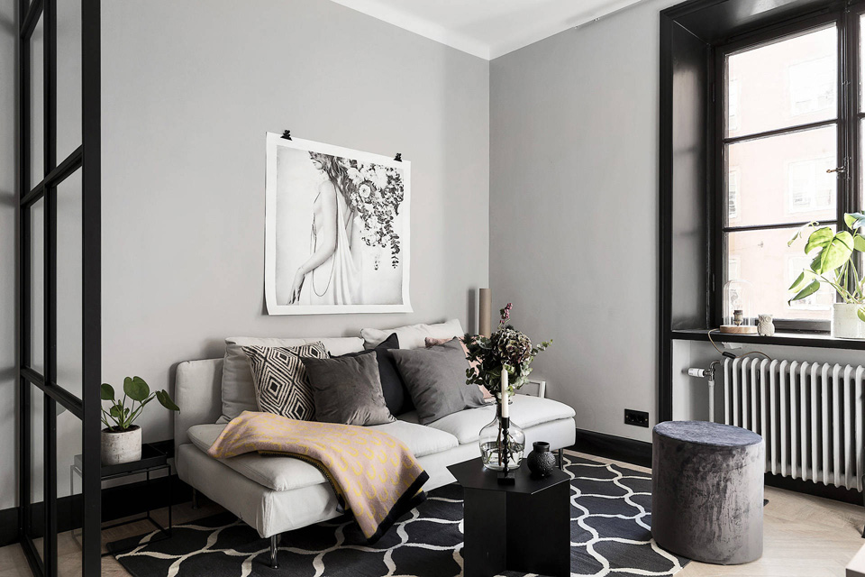 A low partition in the apartment, the interior of which is created from a mix of Scandinavian minimalism and an industrial loft