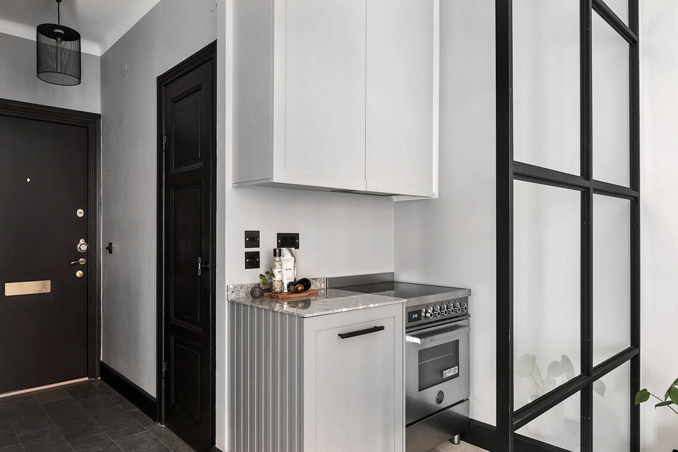 A symbolic partition made of chrome profiles separates the kitchen area from the workplace