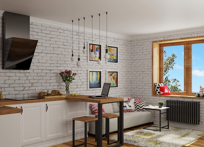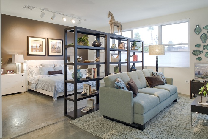 Another original version of the interior decoration of the apartment. Zoning of the studio is done by imaginary walls. For example, the kitchen and living room are delimited by a wooden structure. The bar counter is also ideal for such a solution. The photo shows examples of interesting studio designs.