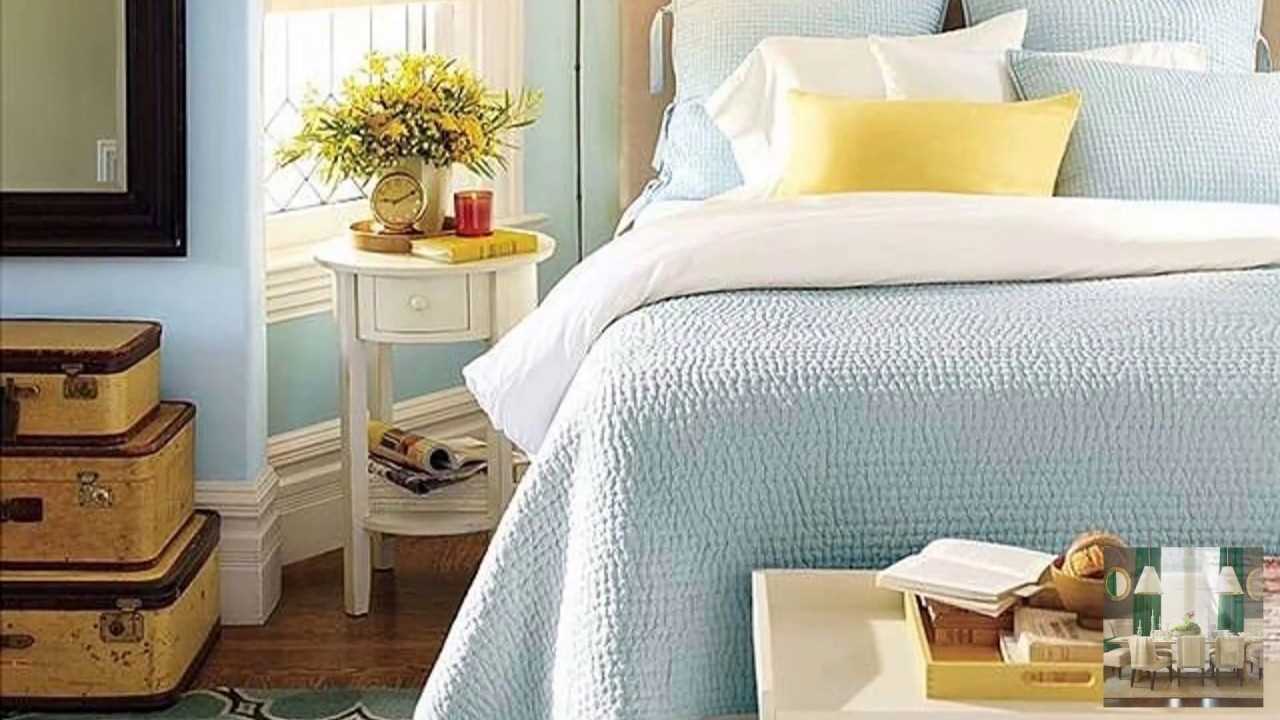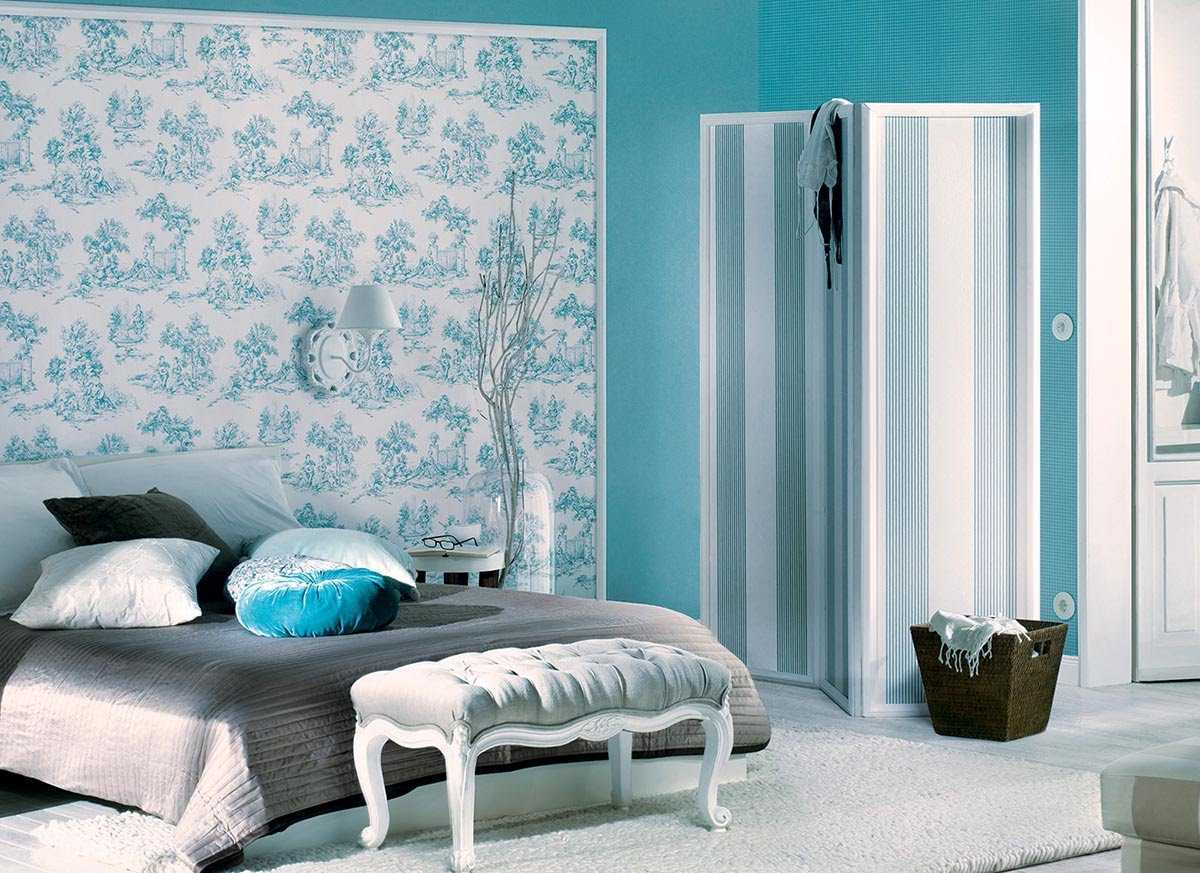 A gentle light blue color refreshes the room, but sometimes it can cause a feeling of cold, so it is important for the bedroom to choose the right shades and proportions. Even the smallest spots are visible on plain light walls, so it is better to choose wallpaper with a pattern, texture, embossing for the walls.