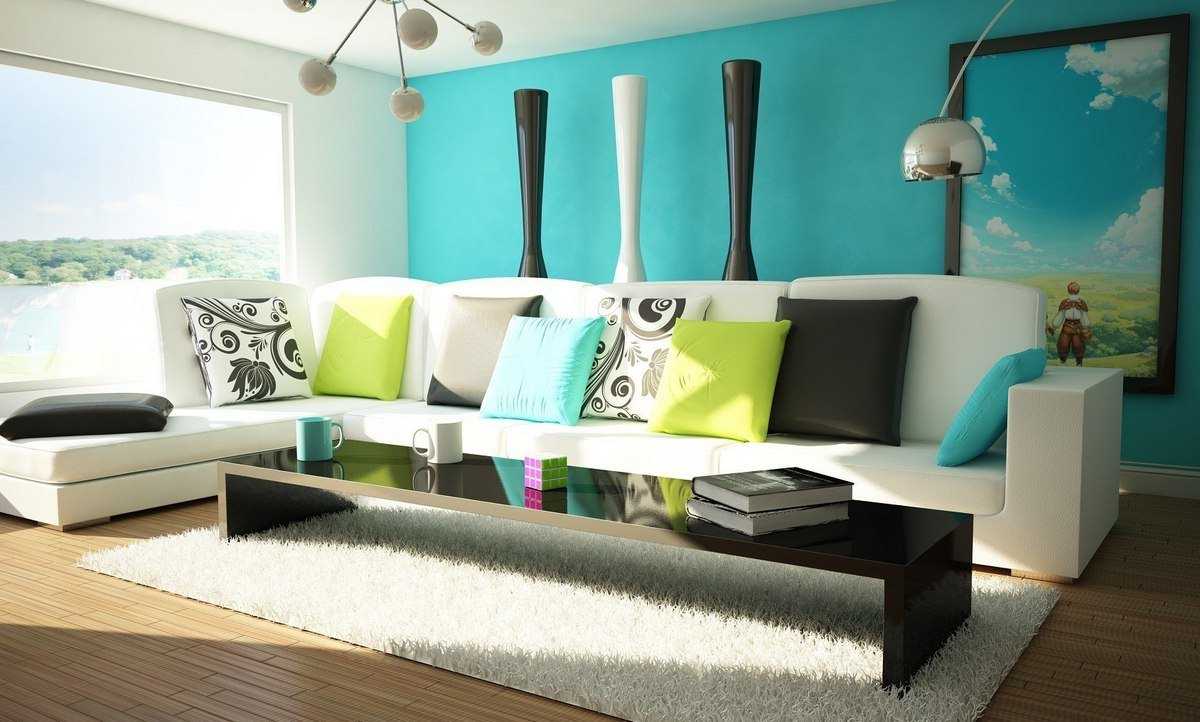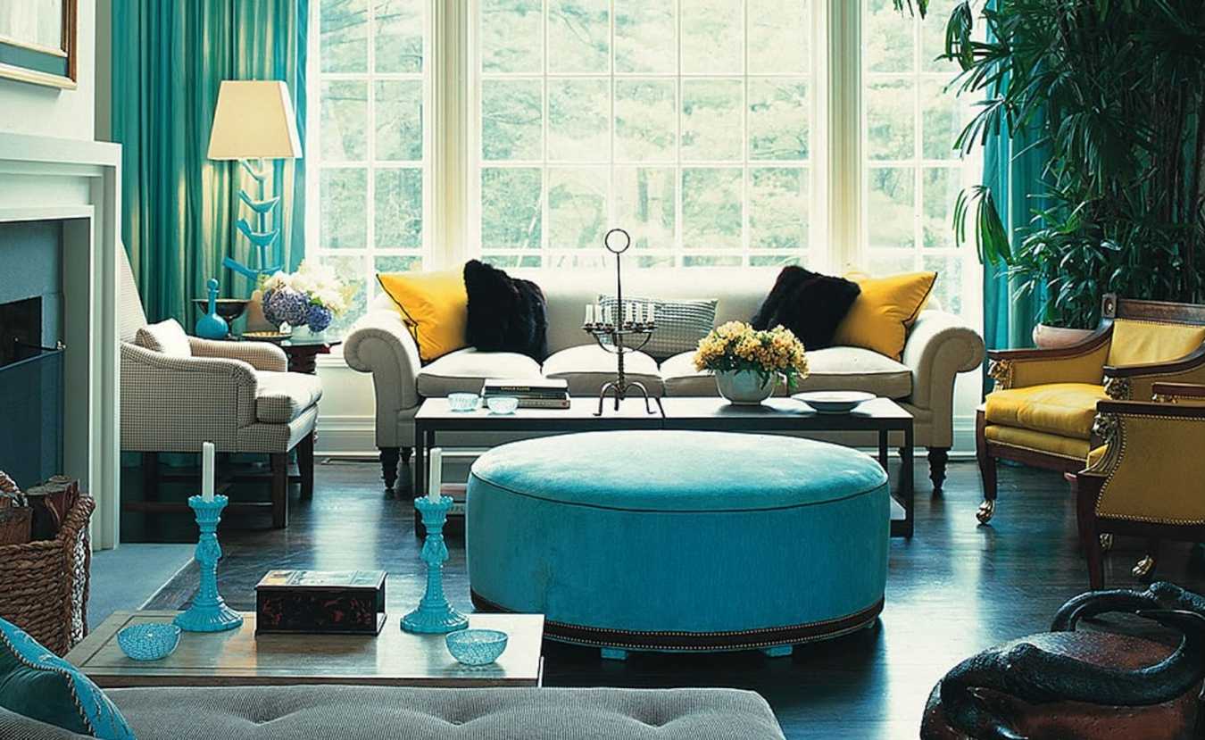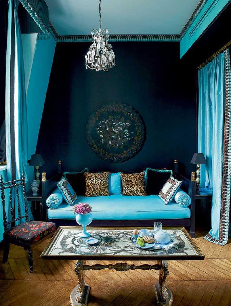 In the living room it can be combined with white or pastel shades. In this case, it is better to take pale blue tones. Bright blue is recommended to combine with bright, saturated colors. Turquoise, complemented by gold trim or a chocolate shade will create a ceremonial, solemn, luxurious interior.