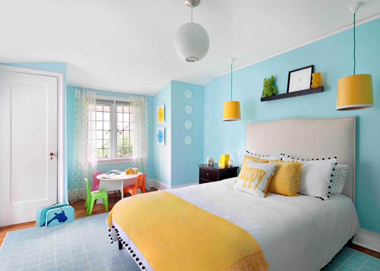 For the nursery, you can choose brighter shades of blue when it comes to the room of a preschooler or primary school student. And not necessarily it will be a boy’s room. “Fairy-princess” interiors are also created with the participation of light shades of blue. In a room where childhood sets its own design rules, combinations of blue with orange and sunny are acceptable.