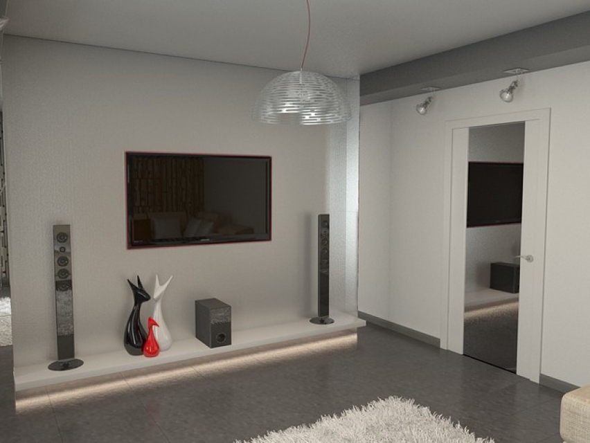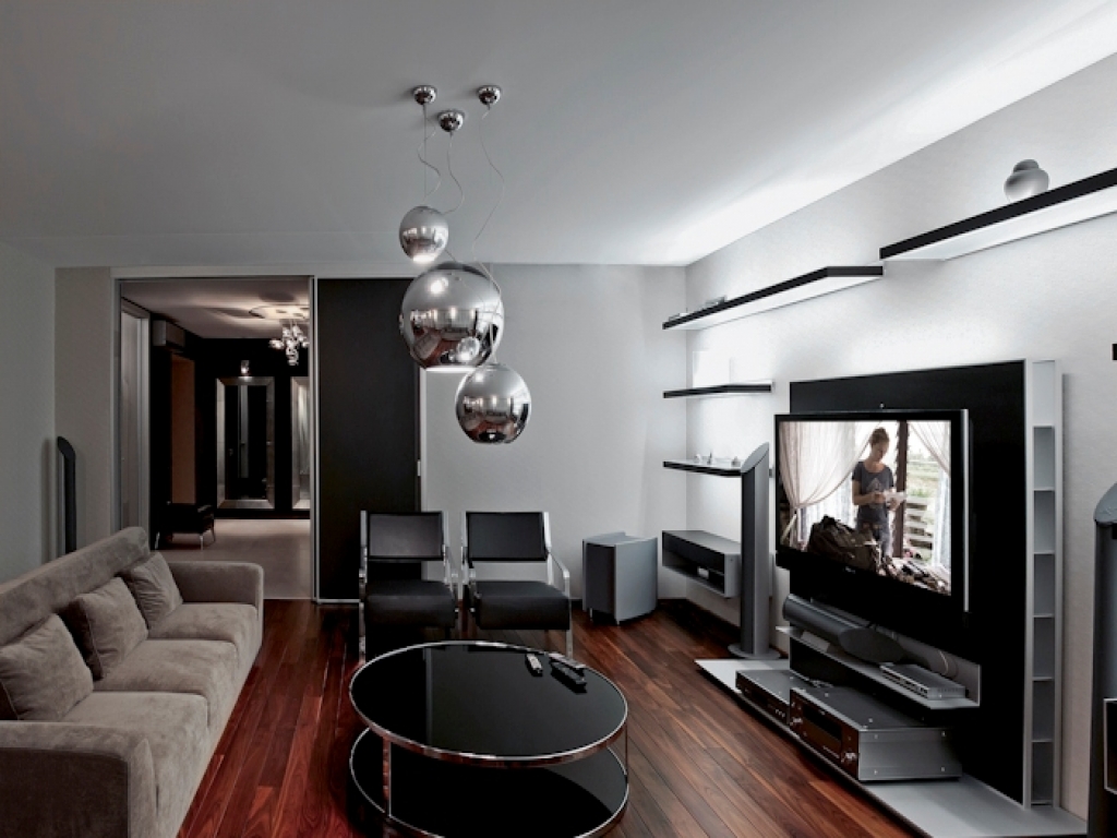 Living room in high-tech style should be equipped with the latest technology. Here we find sliding stands for TVs, secret bars also with a sliding system, voice indicators, etc.