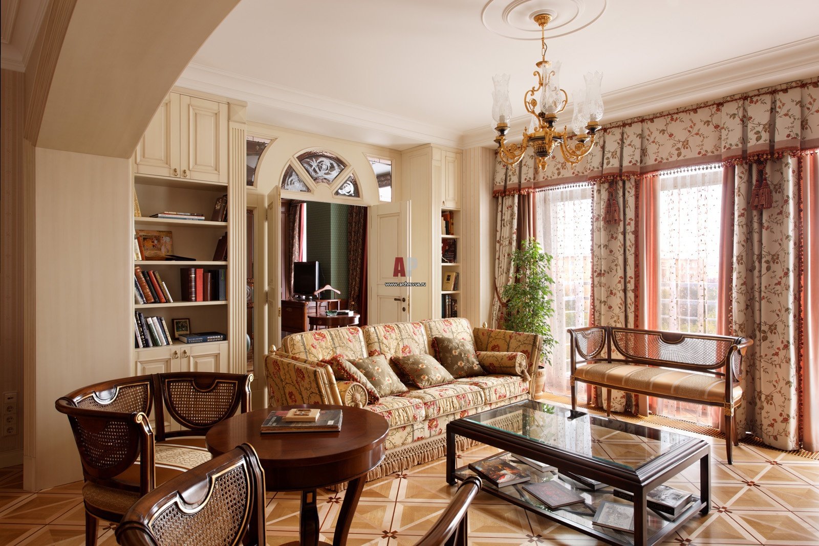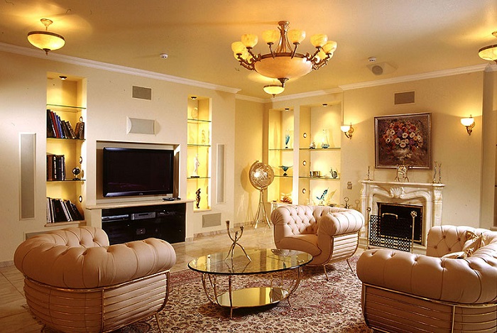 Here we exclude the latest technology, multifunctional furniture, cold light, LED strip as a backlight. We leave comfort by choosing a massive enough sofa, and traditional colors such as beige, brown and milky. For classics is also characteristic white, but always in gentle and soft combinations.